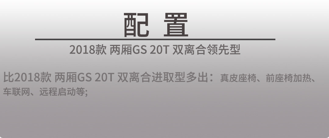 这次教授推荐的是中配GS 20T 双离合领先型,原因很简单,它比低配多了真皮座椅,前座椅加热,车联网、远程启动等实用功能,而又在优惠后很好的把价格控制在15万以下,高配贵出的2万也不过多了一些可有可无的配置来增加豪华感而已,所以根据性价比的维度来说中配车型必然是首选!