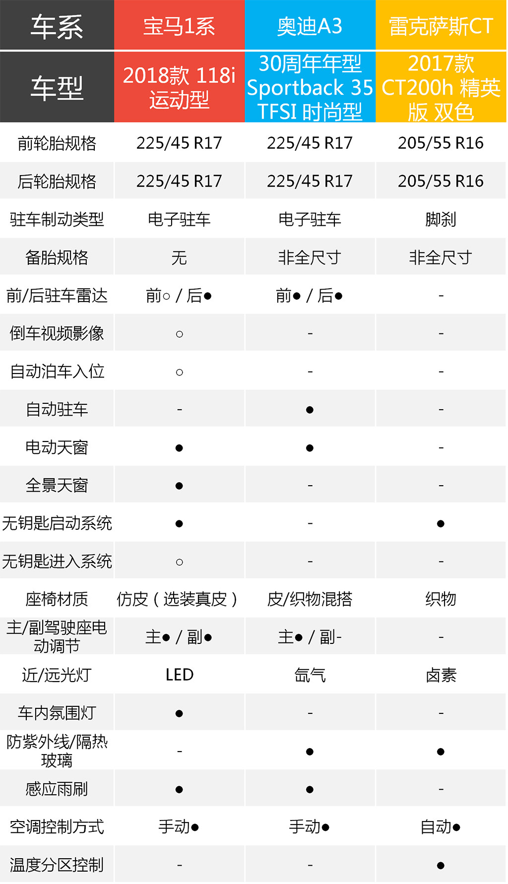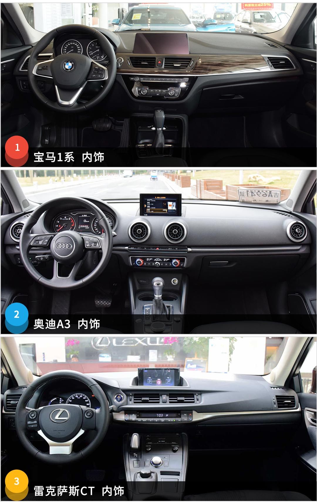 三车相比,奥迪A3内饰相较简约,车厢内圆空调出风口,圆溜溜挡把头,圆圆圆......到处都是圆型元素,作为女性专用车,将是可爱的猪猪女孩。雷克萨斯CT内饰精致感十足,银色饰条以及金属件装饰相当到位,宝马1系的内饰变得最大就是仪表变得简洁,方向盘与挡把样式也变了,很多人有“鸡腿”情节而不喜欢这款车型。