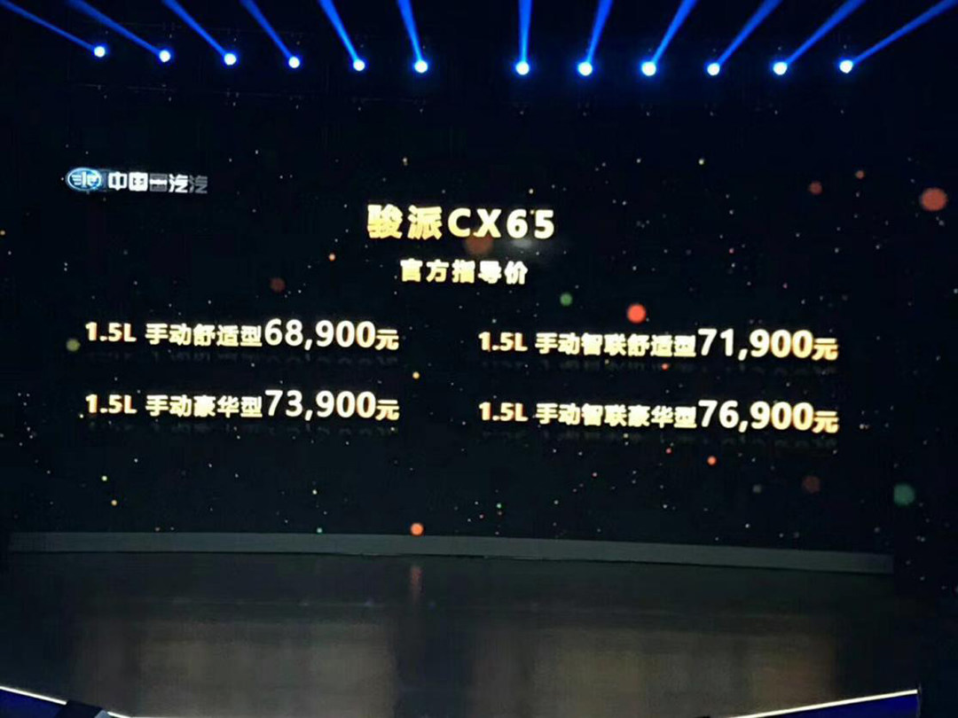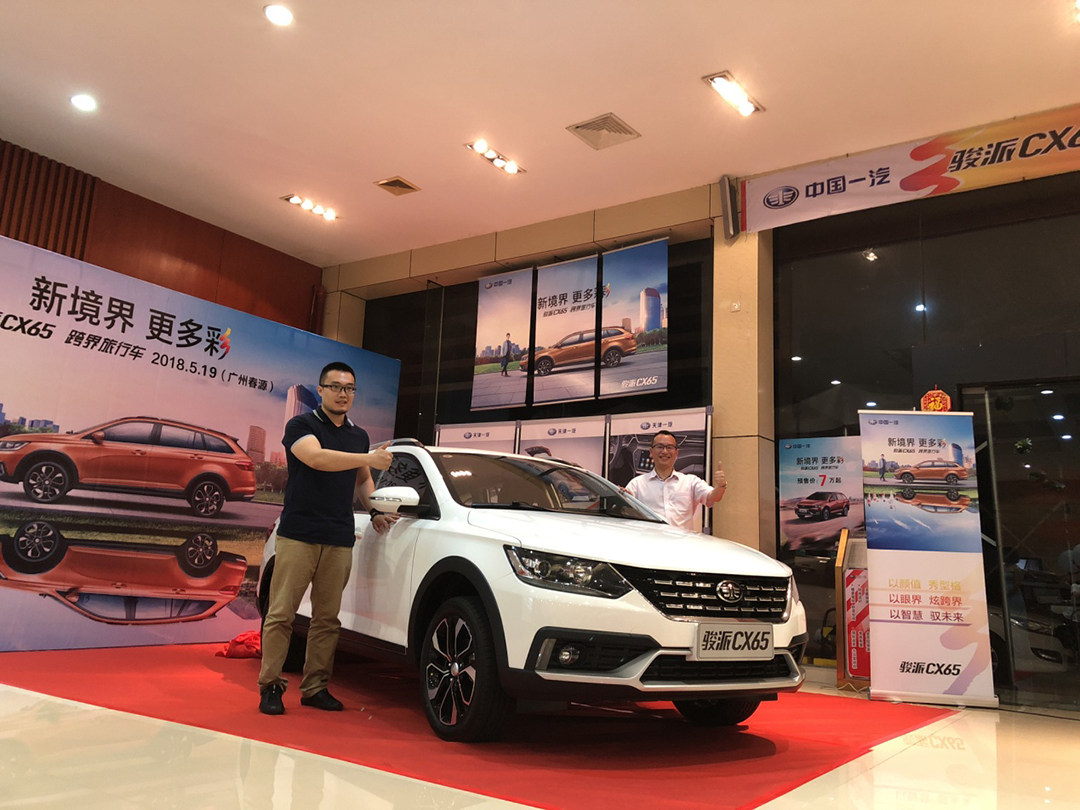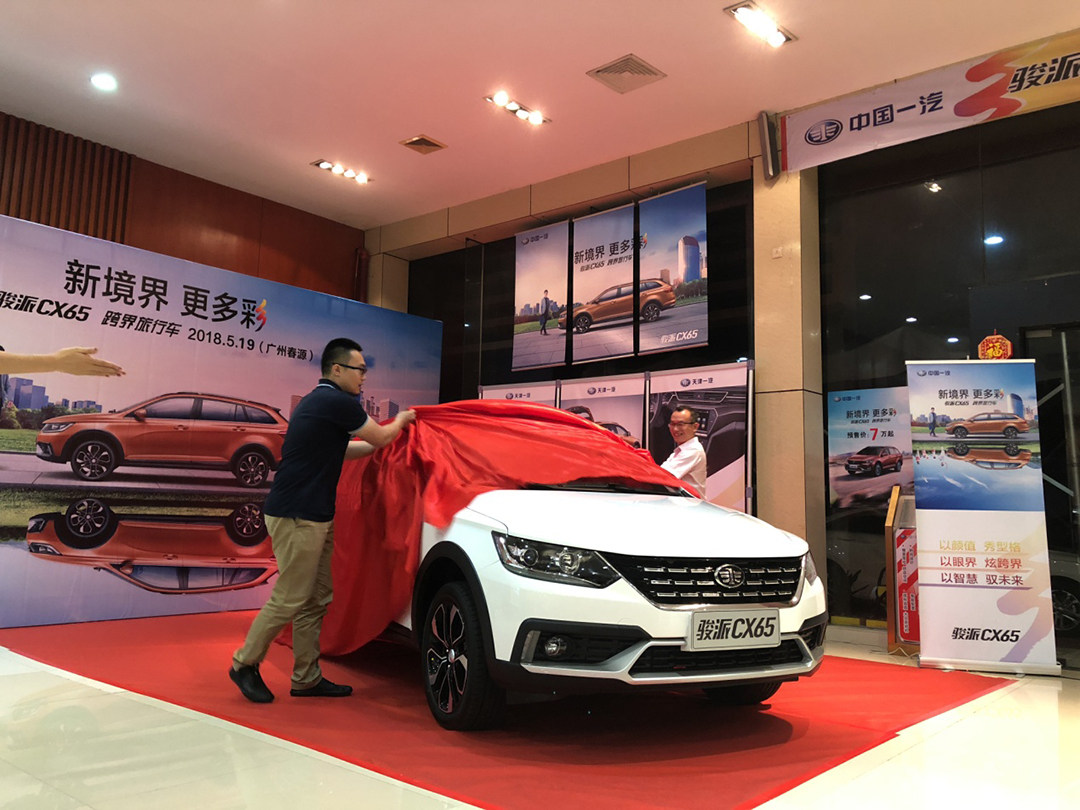 2018年5月19日,“新境界 更多彩”天津一汽骏派CX65广州上市发布会在广州春源红旗汽车销售服务有限公司举办。此次发布的新车车型包括手动舒适型、手动智联舒适型、手动豪华型、手动智联豪华型共4款,均搭载1.5L自然吸气发动机,匹配5速手动变速器,售价区间6.89—7.69万元。