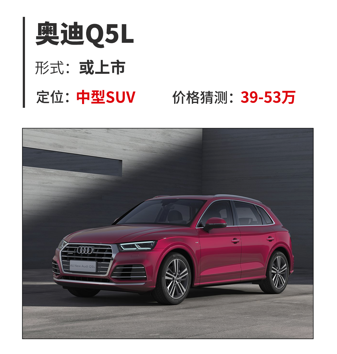 奥迪Q5L几乎可以说是国人最为期待的一款豪华品牌中型SUV,自从北京车展亮相发布以来,最终价格何时落地则成为广大消费者关心的事情,而本届深港澳车展或将会迎来奥迪Q5L的正式上市。