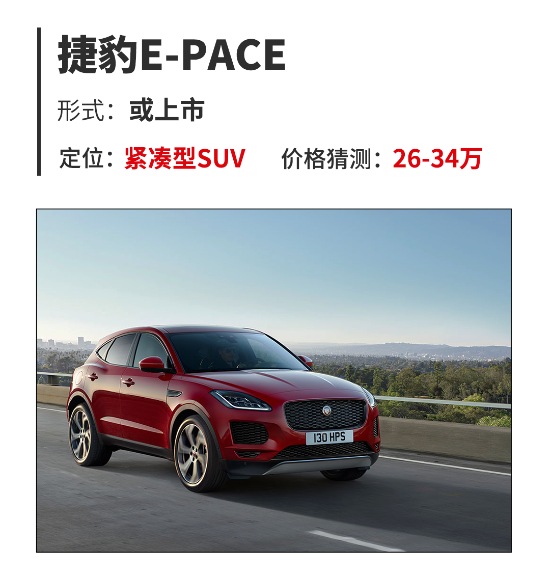 除了跨界的造型和与F-Type极其相似的内饰氛围以外,50:50的前后配重比则更是成为了这款紧凑型SUV另一项吸引人的卖点,在这个紧凑型跨界风SUV身上将会有怎样的操控素质着实令人期待。