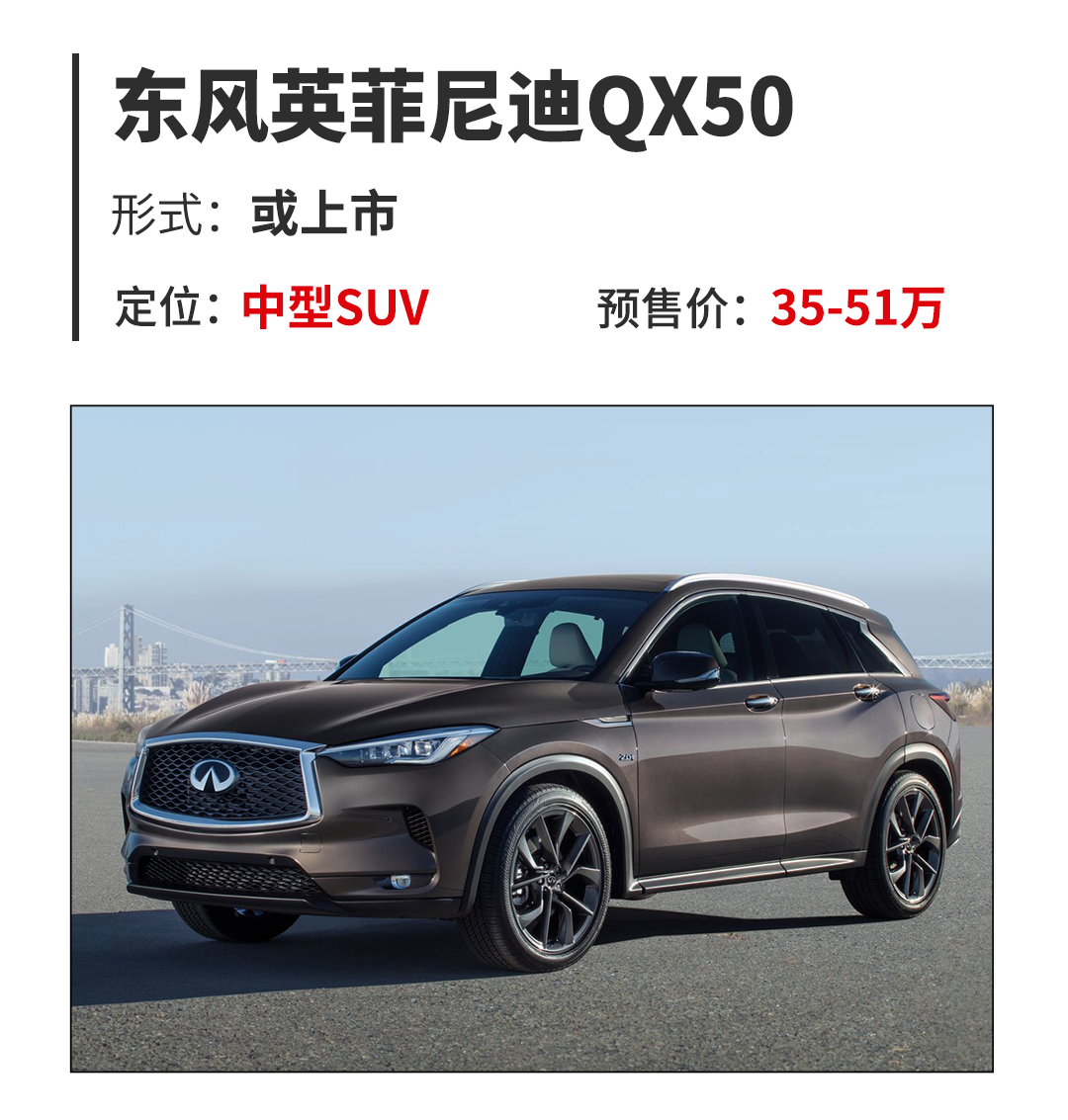 教授收到了可靠的消息,国产的全新QX50或将在本次深港澳车展上正式迎来上市,之前已经公布的预售价35-51万元已经显得非常具有诚意,而从QX50所呈现出来的产品表现,它也将是一款非常具有潜力成为未来拉高英菲尼迪品牌在中国消费者心目中形象的SUV。