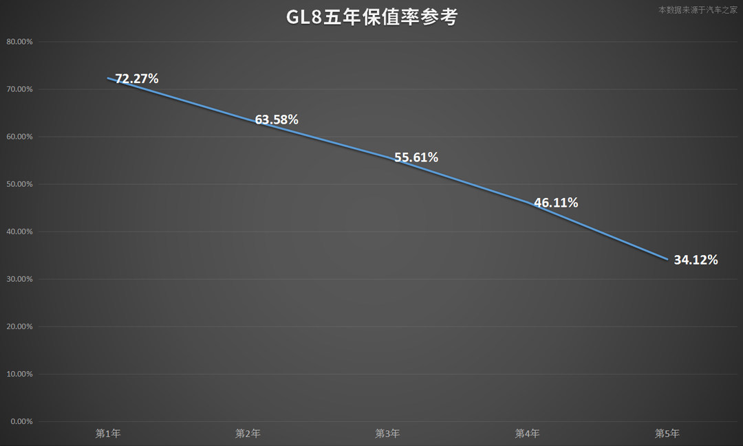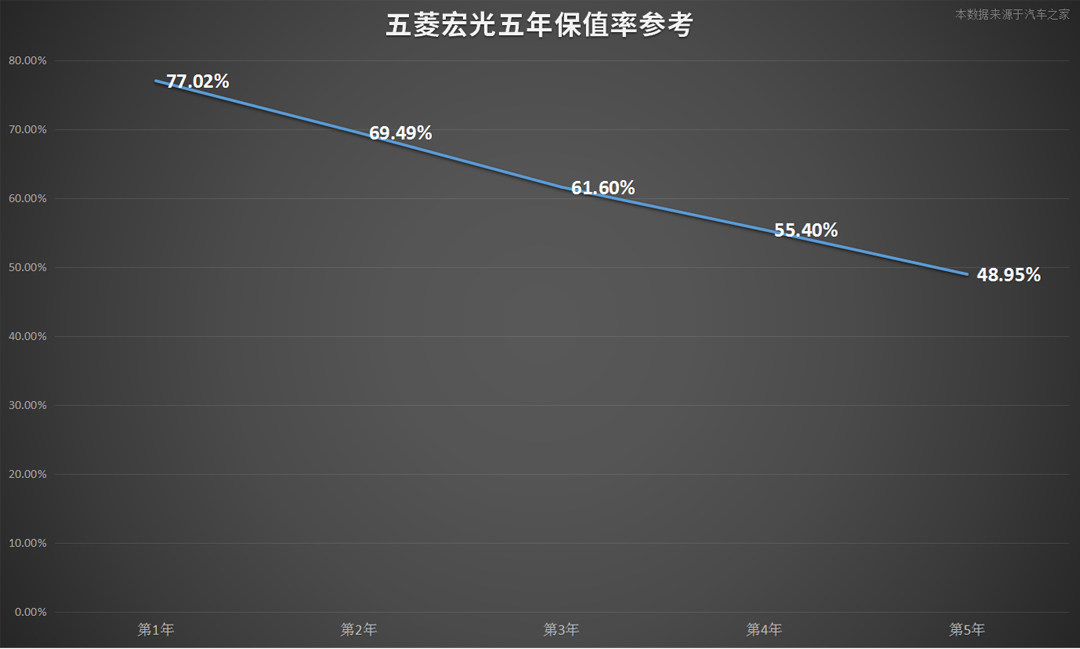 那作为“神车”信仰的五菱宏光,在保值率表现上会怎样呢?从表中可以看到,第一年的保值率高达77.02%,而随着时间的累积,降幅还算比较平稳,到第五年还有近50%,当然,这也和它本身较低的车价不无关系,再低也会有个限度。