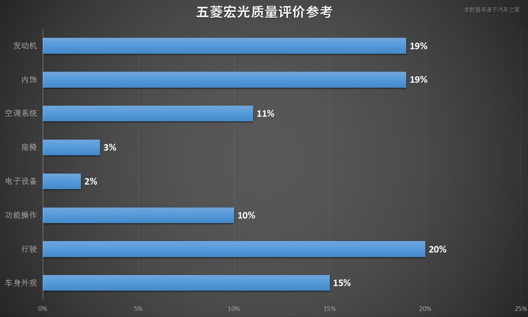 在车主口碑的质量评价中,五菱宏光被反映得最多是行驶方面的刹车偏软问题、内饰方面装配得不够精致、还有就是发动机在空调开启后会出现乏力的现象,不过考虑到它的售价及排量,这些问题不算很大,并且大多数车主对五菱宏光的整体表现还是趋向满意的。