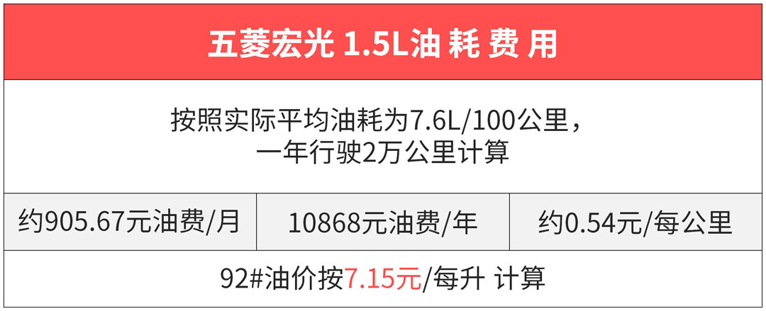 燃油经济性是这个价位买家着重考虑的,而五菱宏光的主销车型排量为1.5L,根据百位车主得出的实际平均油耗为7.6L/100km。