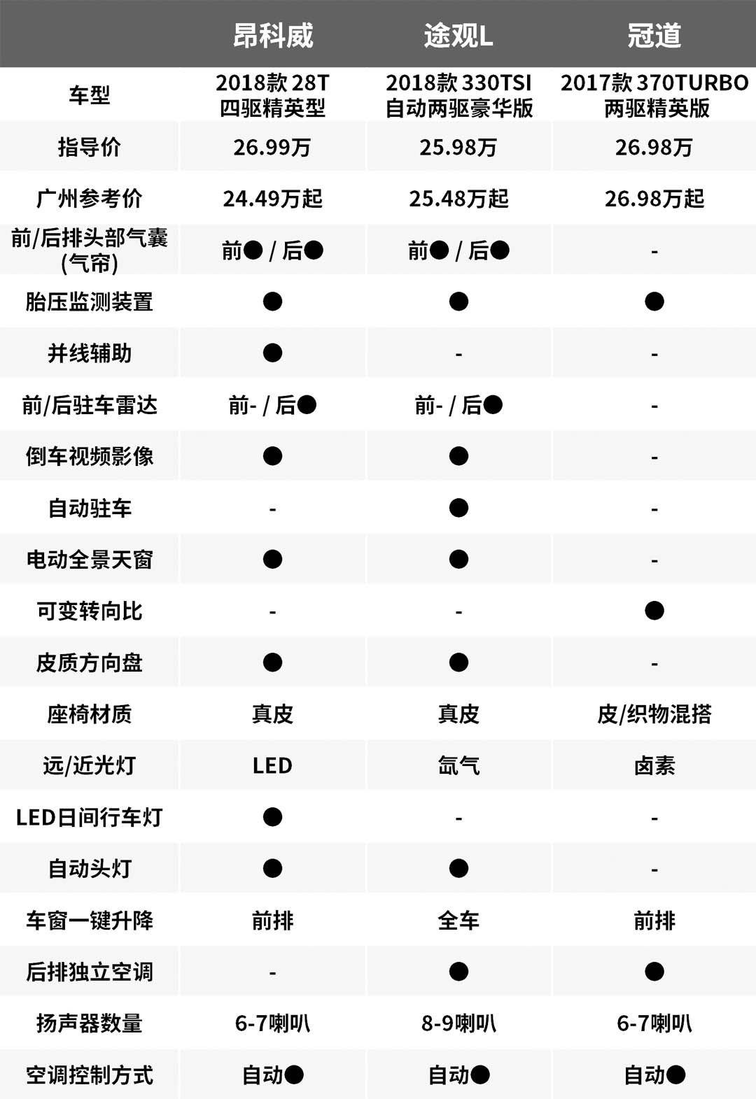 这三款SUV都是目前市面上比较主流的选择,其中昂科威在市场上有不小的优惠,性价比较高,较豪华的内饰设计的行驶质感都是其强项,但空间表现相对来说略逊一筹,而途观L的整体表现更加均衡,没有很明显的优点也没有很明显的缺点,而冠道最大的特点在于超大的空间以及整车的豪华感,追求空间的话冠道是最好的选择。