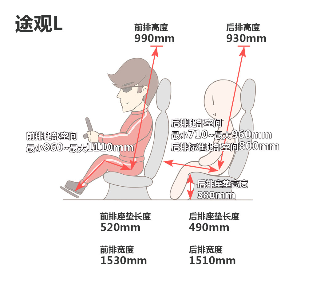 途观L的前排头部空间为四指,后排头部空间为3指,腿部空间大于两拳,在加了“L”之后在空间表现上还是能够让人满意的。其前排座椅偏硬,对身体的包裹性较好,后排座椅则比较软,坐垫长度适中,但是其后排地台凸起较高,影响中间乘客的乘坐舒适性。