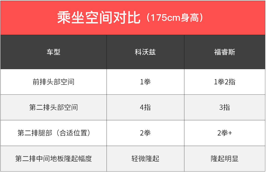乘坐空间及舒适性是永远都离不开的话题,动力上很多人还可以迁就,够用就行。但是要考虑到家人的乘坐舒适性,这就不能马虎了。还好科沃兹和福睿斯都没有令我们失望,福睿斯在轴距上是占优的,比科沃兹的2600mm多了87mm,同时带来的是腿部空间的宽裕。只不过科沃兹中间地板位置较为平坦,中间位置成员乘坐要舒服一点。
