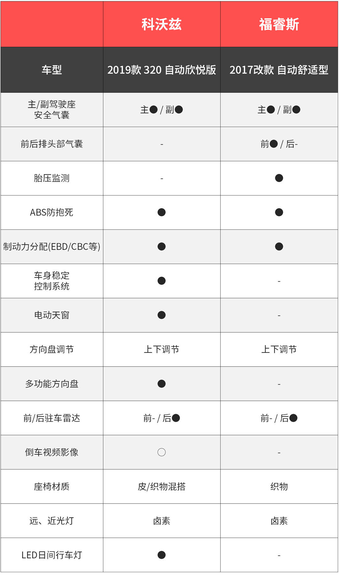 看完前面的干货之后,很多有意向的兽粉们是不是准备动手了。虽然同样对配置不抱有期望,但这次教授跟你说,惊喜还是有的。配置的对比上教授挑选的是科沃兹自动欣悦版、福睿斯自动舒适型,两车的参考价都在8万多左右。科沃兹的配置要丰富些,胎压监测、车身稳定系统这些安全配置都有;福睿斯虽然没有科沃兹配置高,但多了前排侧气囊,人身安全得到保障。