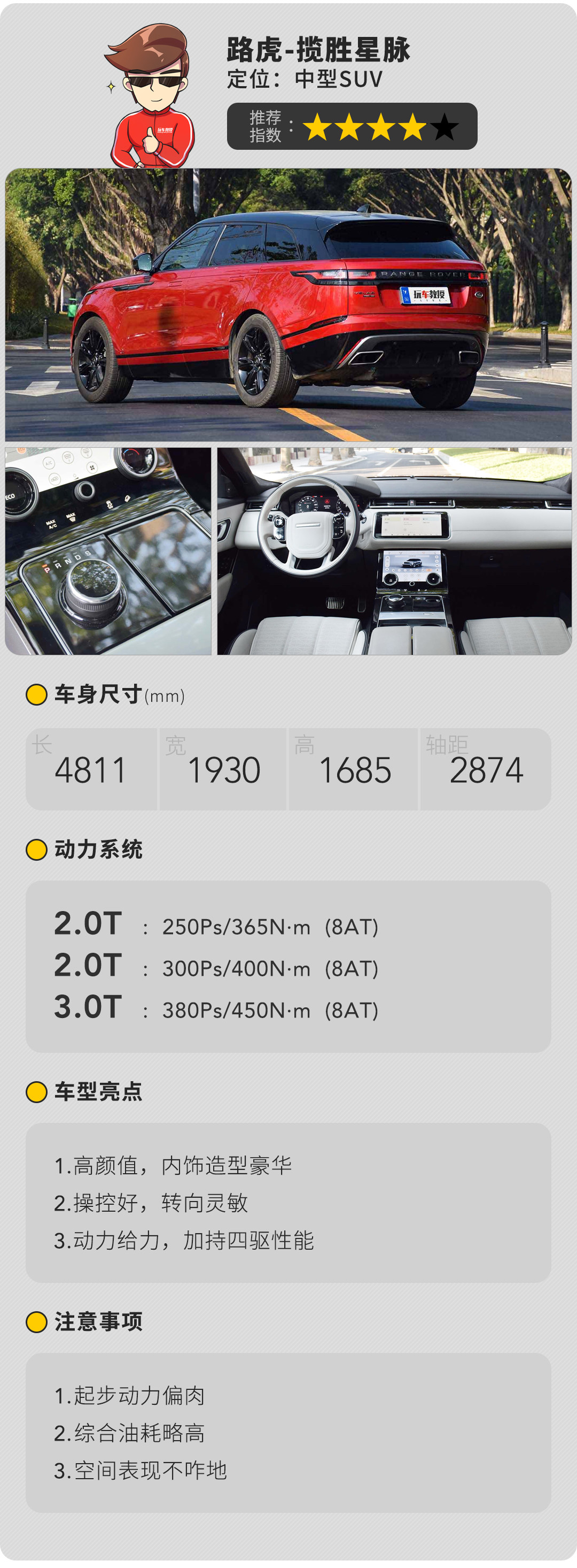 车型点评:星脉相比起以往的路虎,造型更为新颖,内饰也是异常清新脱俗,简洁时尚的设计之下又不缺乏豪华感和质感。全系标配的双中控屏幕、标志性的旋钮式换等配置也是展示出了满满的科技感,在一瞬间就能够吸引住人的眼球。搭载的3.0T机械增压发动机+8AT变速箱的动力总成,具有出色的线性动力输出,最大马力可达到380PS,峰值扭矩450牛.米,另外,偏向于舒适性的底盘调校可以很好的隔绝路面传来的部分振动,从而给到驾驶者在路上的驾驶乐趣和信心。