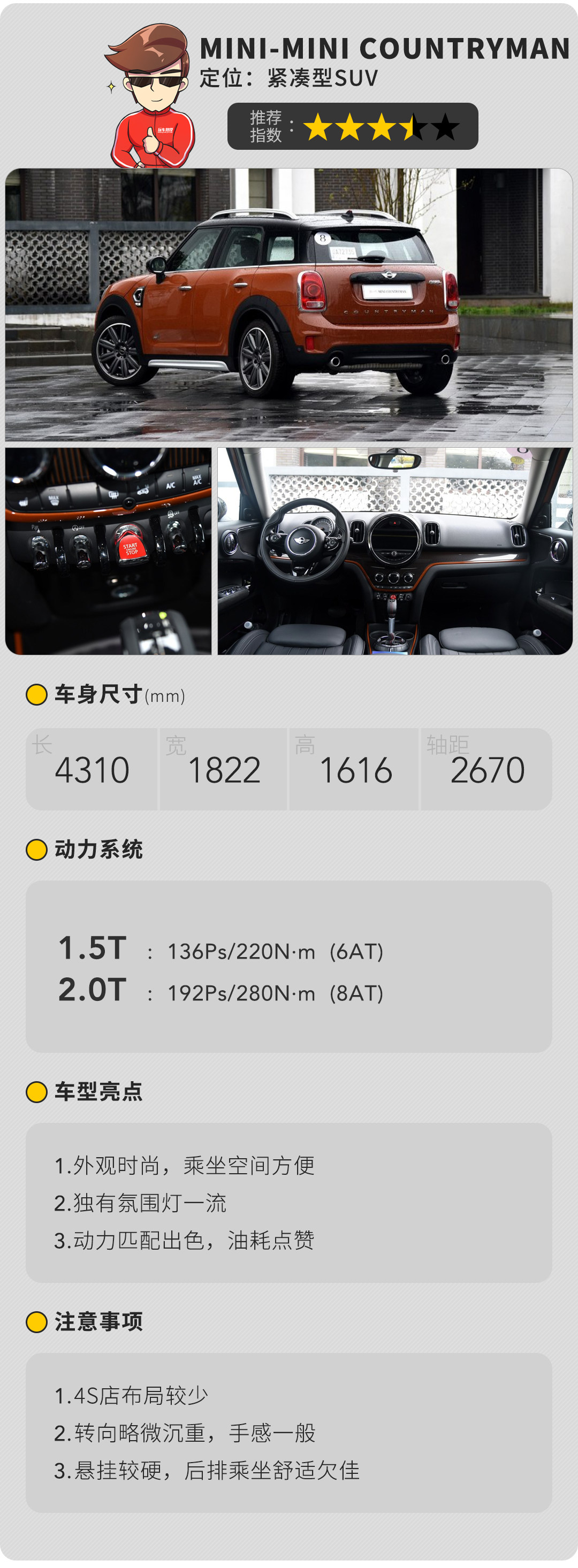 车型点评:MINI车型总能流露出可爱的元素,圆润的线条给人感觉非常有亲和力,憨态可掬的形象也总是令人耳目一新。内饰整体布局较为简洁,但选材用料和做工都比较精致,精致感十足,罕见的拨杆式按钮更是非常的讨人喜欢。动力方面,MINI搭载了1.5T和2.0T两款发动机,其中2.0T+8AT的动力总成表现还不错,开着很畅快,换挡速度和平顺性也都很好,就是动力衔接稍微有点慢,在降挡超车之时,油门响应也略有迟滞。