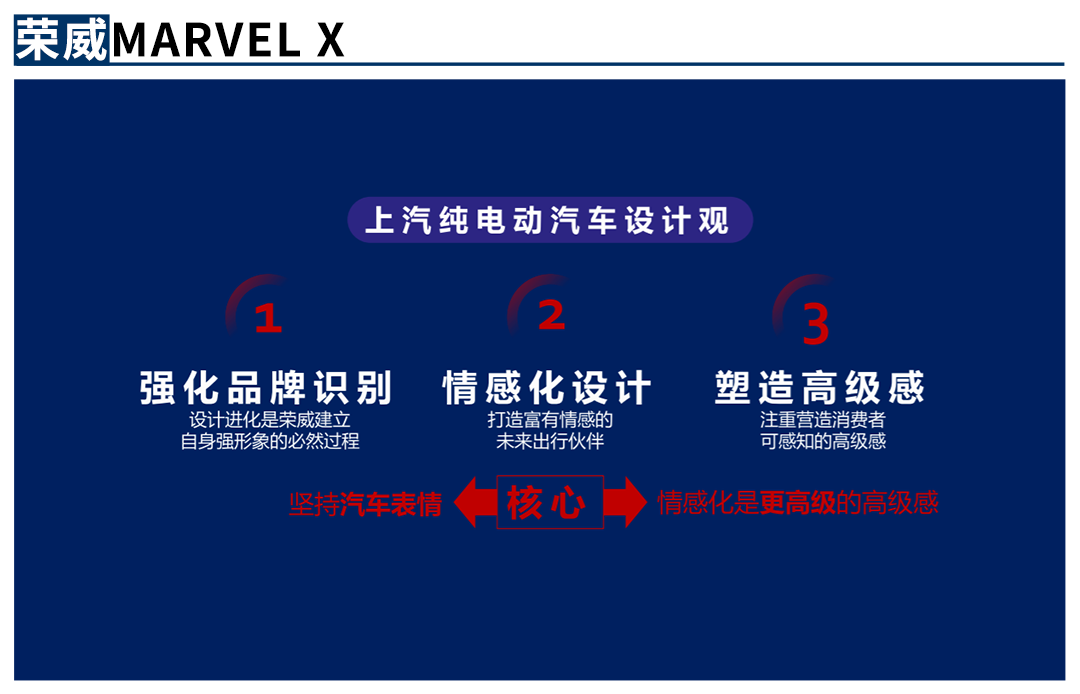 上汽作为一个善于发现、思考的企业,它决定将“强化自身品牌识别力度、打造富有情感化的设计、塑造消费者可感知的高级感”作为其开启电动高端化市场的设计理念。而作为上汽全新的智能纯电示范产品,也是主打高端市场的首款新能源车型,荣威MARVEL X的设计有着更多情感化元素,在高级感、性能感、电动感上作出平衡。