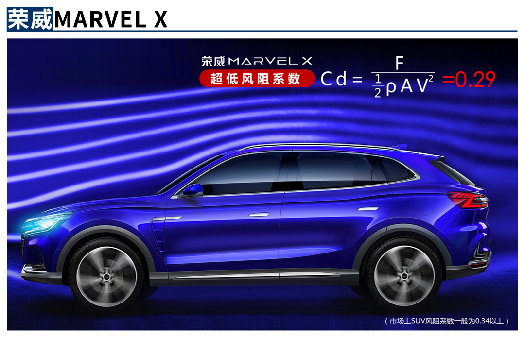 再配合上高性能轮毂、冲击前装甲、尾部双刃导流饰件、低风阻贯通式后视镜、导风前保、导风鲨鱼腮、隐藏式把手等,荣威MARVEL X的风阻系数仅为0.29Cd,媲美超跑的低风阻系数。