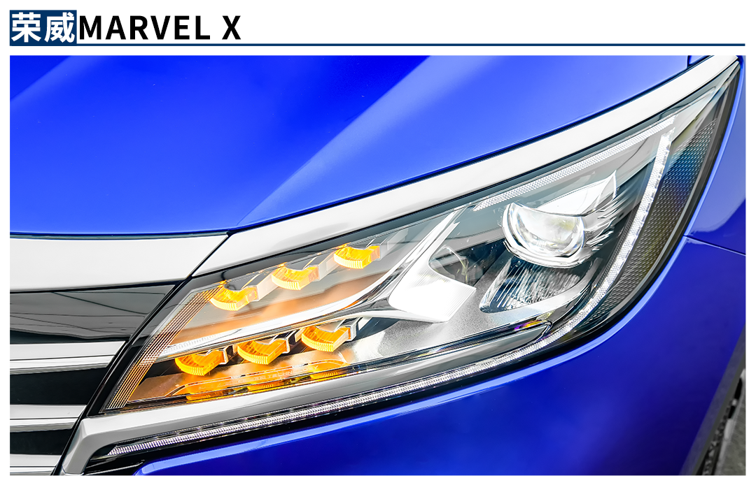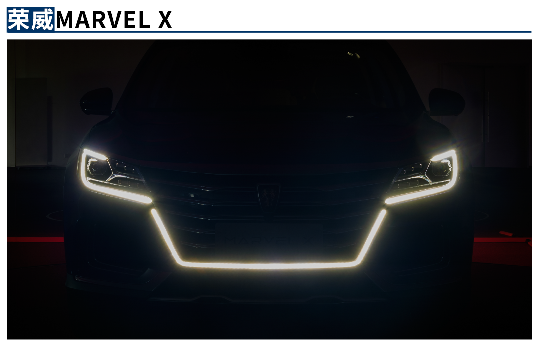 荣威MARVEL X的前脸格栅外轮廓使用LED灯带进行了半包围勾勒,以展翼光弧刻画家族特征,给予荣威MARVEL X强烈的辨识度;搭配箭翎全LED大灯,豪华流水转向灯,前脸的高级感更是油然而生;尾灯同样有着流动转向灯功能。而横贯车尾的镀铬饰条两端衔住了尾灯的设计可以说的跟概念车十分接近,显得霸气有力。