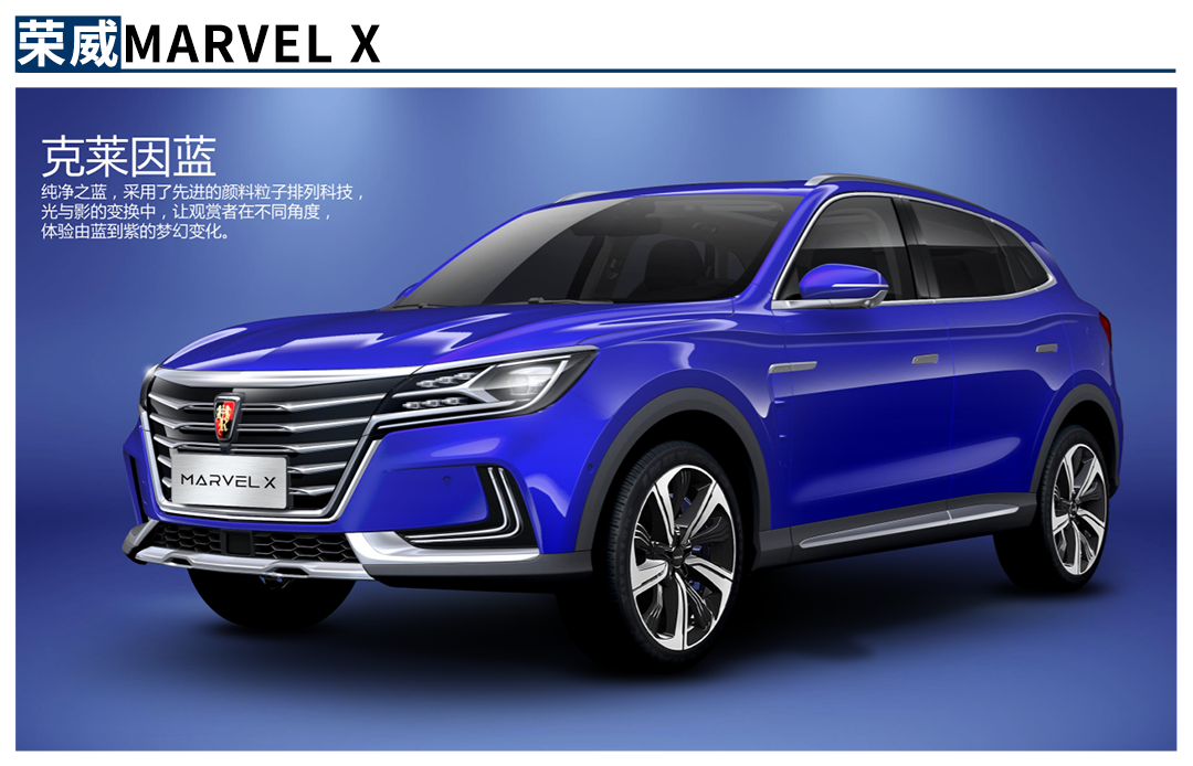除了上面所提到的强而有力的车身曲面、饱满圆润的车尾等“韵大于律”的设计,荣威MARVEL X的克莱因蓝车身颜色也是非常值得一提的。克莱恩蓝是非常纯净的蓝色,也是一种具有高级感的蓝色。荣威MARVEL X采用了先进的颜料粒子排列科技,光与影的变换中,让大家在不同角度,体验由蓝到紫的梦幻变化,打造超跑视觉。据教授所了解,除了主打色克莱因蓝,荣威MARVEL X还提供了银叶金、珠光黑、宝石红、珠光白的车身颜色供消费者选择。