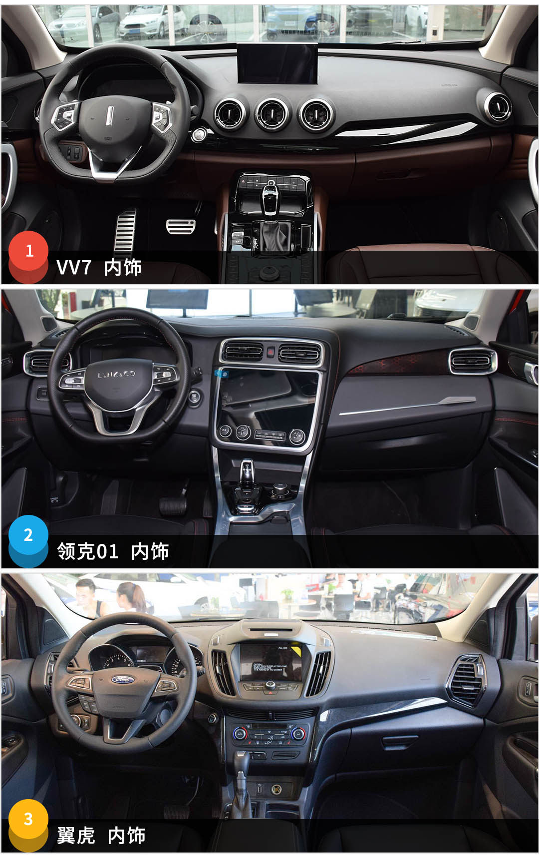 说了视觉上的感受,再来说一下触觉上的感受。领克01真皮方向盘跟座椅(最低配不是真皮)舒适性良好;VV7虽然大部分车型都是仿皮座椅(顶配真皮),但全系支持主副驾驶座椅电动调节、后排靠背角度调节,方便且舒适;翼虎总算在内饰的感受上扳回一城,除了上述功能外,全系还有腰部支撑调节,是长途旅行舒适的保障。