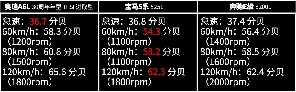 隔音效果也是判定车辆豪华程度的重要标准,三台车分别在三种车速下测试,三车的静谧性都比较好,但是鸡蛋里挑骨头的话,奥迪A6L隔音效果三者中最一般,其次奔驰同奥迪宝马相比,同车速下,转速却最高,而隔音并不是最差,证明奔驰隔音还是做得比较到位,但是回到现实,转速高不利于省油。面对隔音问题,由于A6L现处于产品的末期,难免标准有些落后,而E级、5系经已换代,各方面都迎来升级改造。