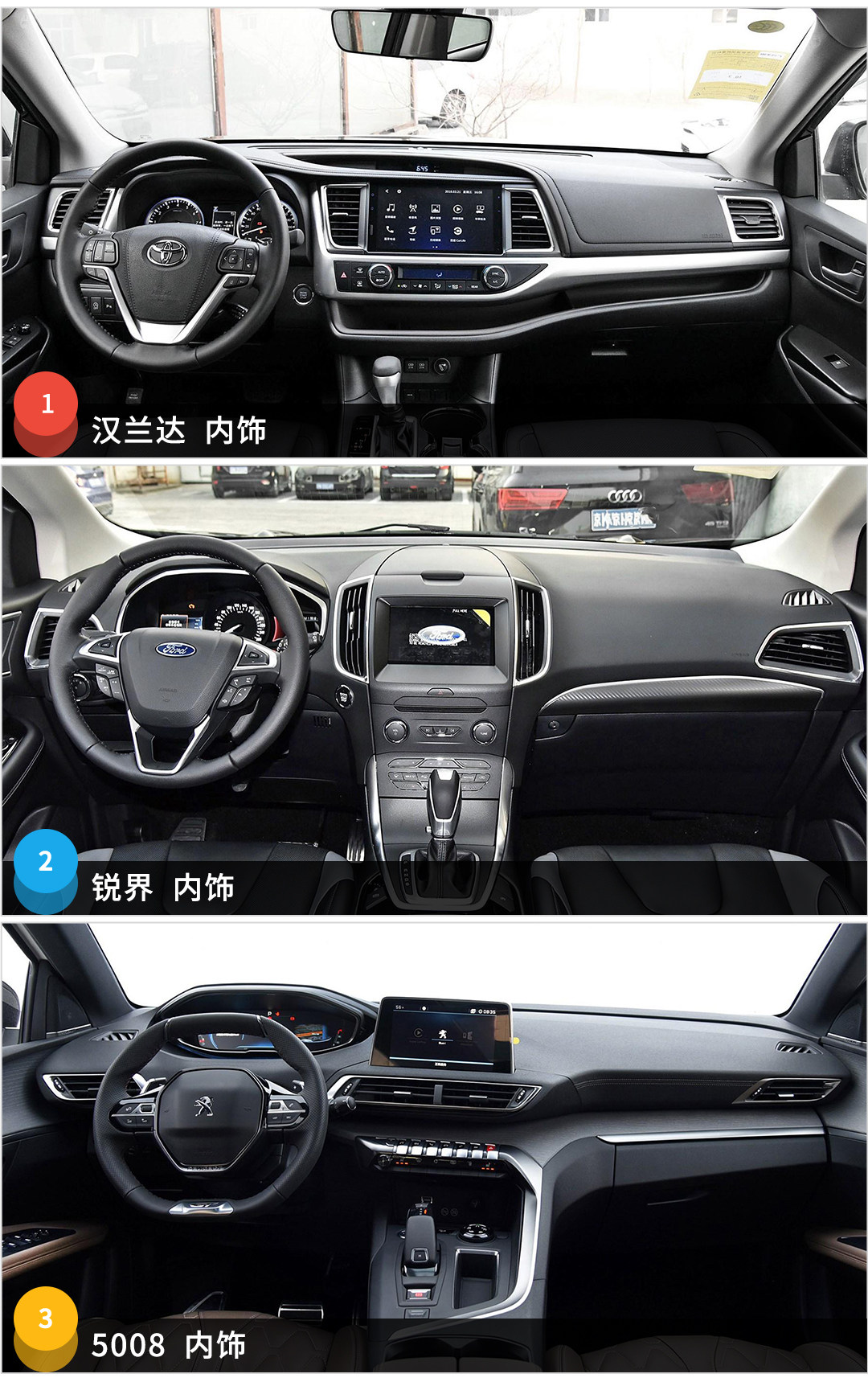 在内饰上汉兰达还是浓浓的居家风格,一切都是那么简约,缺乏一些设计感。锐界的内饰风格同样没什么新意,采用左右对称的设计风格,实用性还不错。5008的内饰风格则是科技感与设计感满满,类似飞机座舱的驾驶室相信还是能令许多司机在驾驶时保持兴奋的。在用料上三车表现都不错,中控部分都采用软质材料包裹,档次感不俗,其中锐界的使用的材质手感最好,值得称赞。