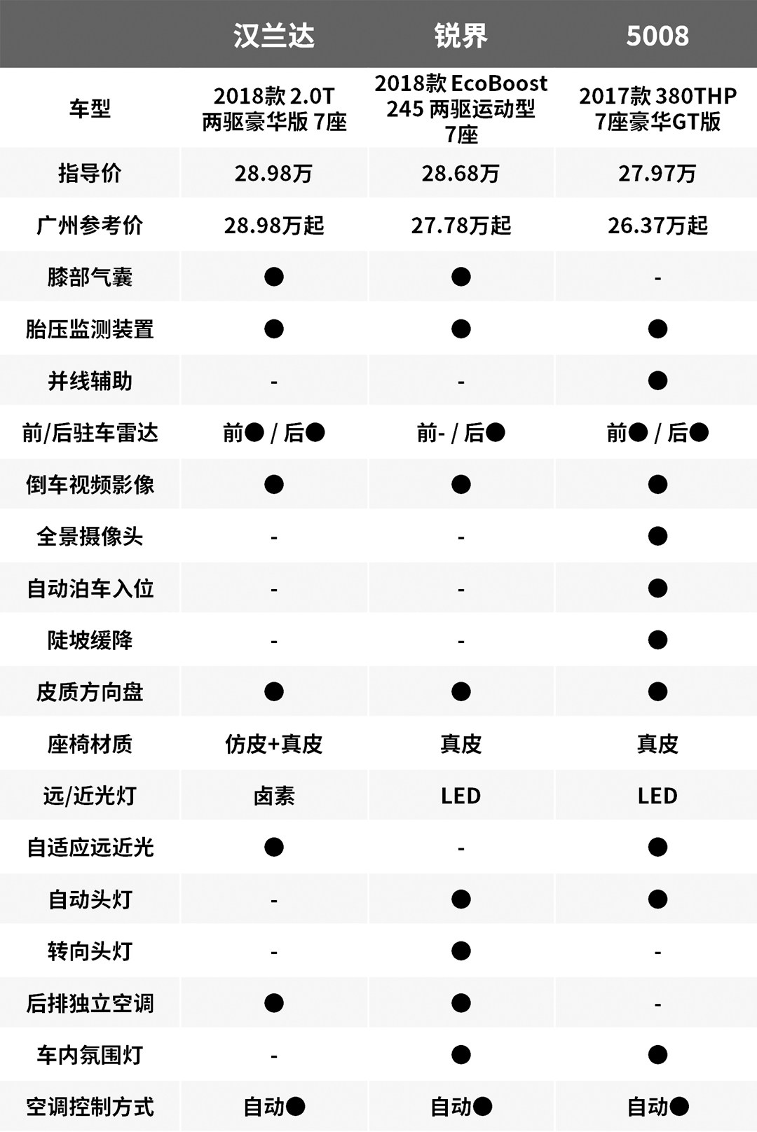 以上三款车是目前市面上比较主流的七座SUV,假设对七座空间要求较高的话,那么汉兰达是一个比较好的选择,不仅乘坐空间宽敞,舒适性也很高,但是相对中庸,没啥激情。而锐界七座空间表现尚可,同时操控极佳动力充沛,但是舒适性不如汉兰达,油耗也是一个槽点。5008的七座空间表现一般,但是其设计感是最强的,更加适合追求个性的消费者。