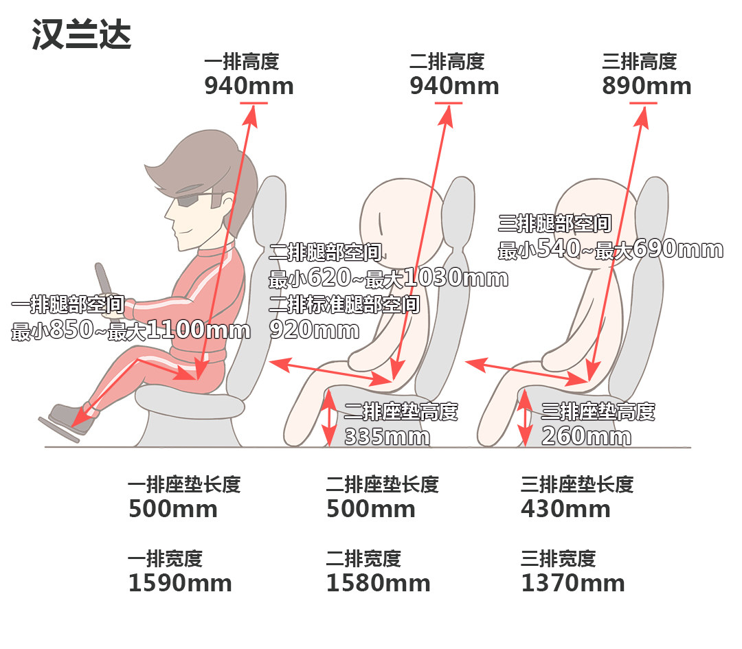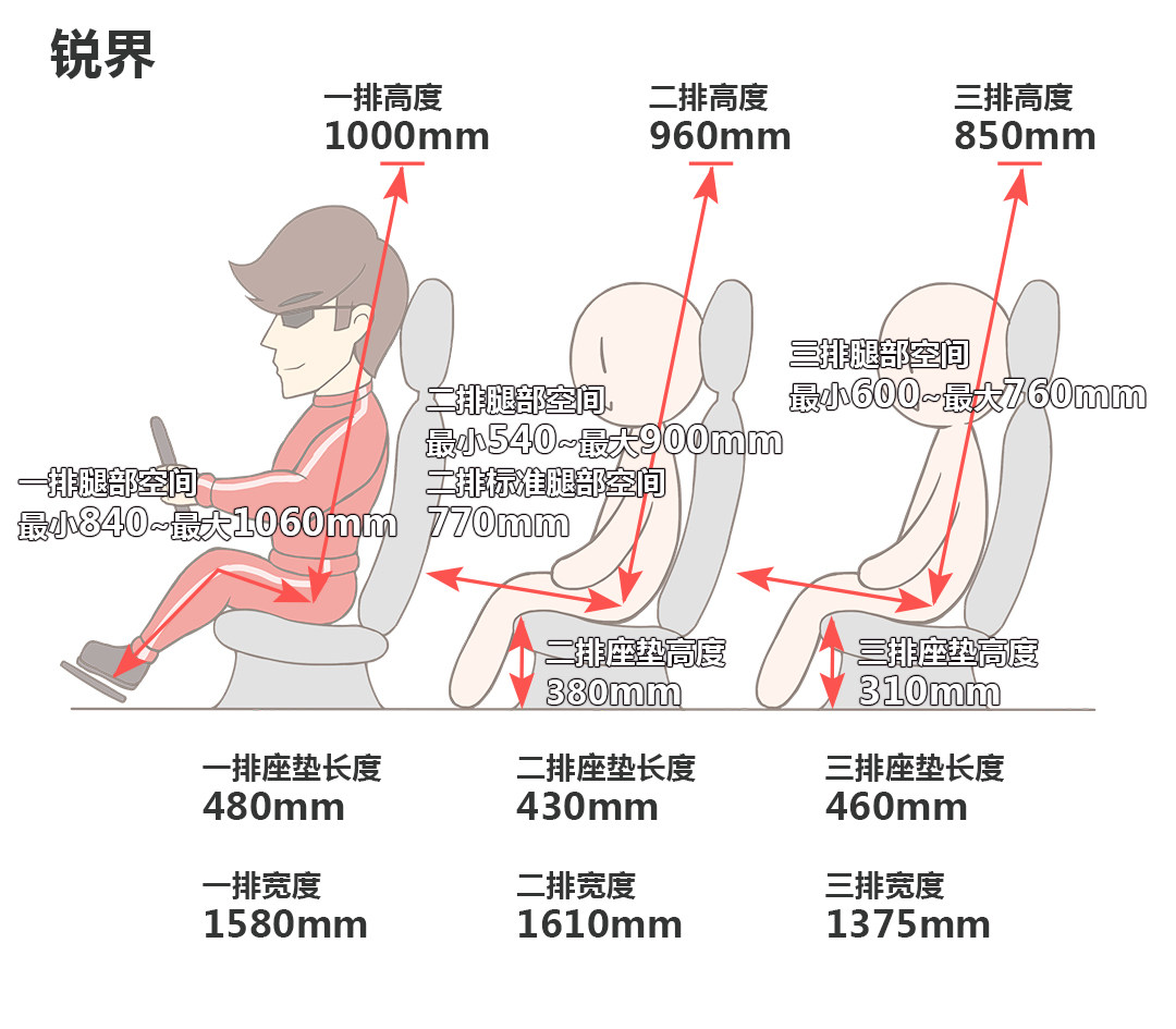 锐界前排头部空间为一拳三指,第二排头部空间为四指,第二排座椅同样可以移动,腿部空间为四指至两拳,进入第三排,其座椅可以小幅度前后移动,腿部空间为零到一拳,头部空间与汉兰达一致,几乎都会顶头。