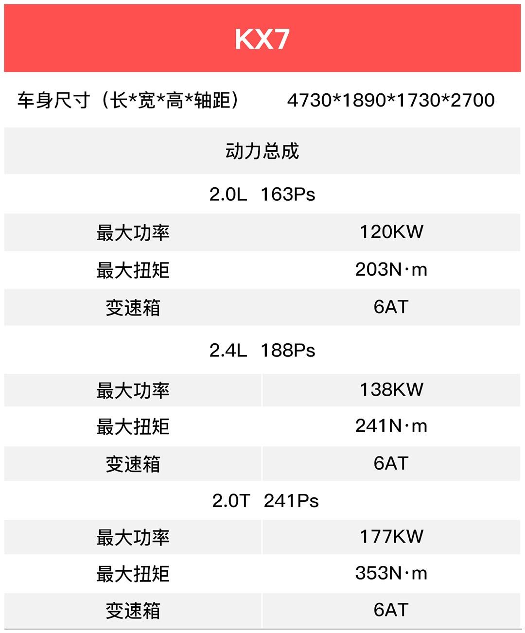 虽然KX7瞄准的市场是紧凑级SUV与入门级中型SUV之间的市场,但是它的车身尺寸确实不小,而且动力配备的选择也挺丰富,再加上2.0T涡轮发动机车型是7座车型,这也让不少的消费者为之心动。