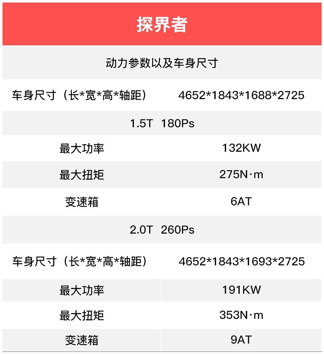 探界者的外观霸气,即使是中型SUV的级别,其操控也是不错,1.5T的入门车型动力足够,2.0T的就更不用说啦,且探界者的乘坐空间不小,5人乘坐还有余裕,喜欢大空间的朋友可以看过来了。