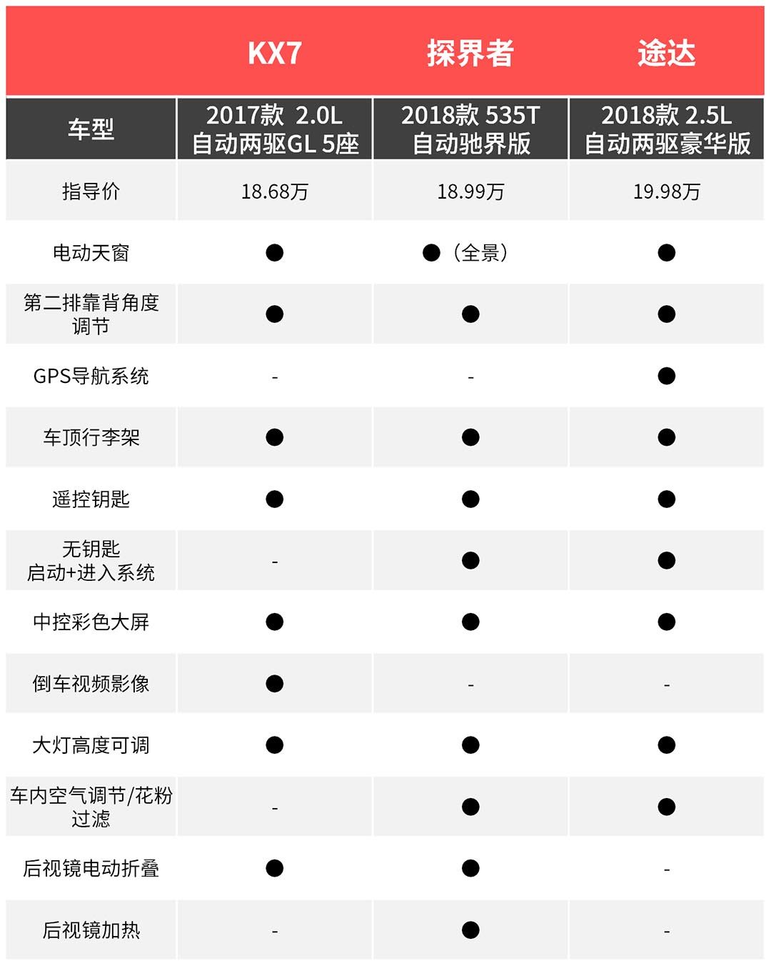 虽然途达推荐的车型并没有4驱,但对于大多数时间在铺装路面跑的朋友来说已经足够了;而KX7推荐的是次低配,比低配的指导价高了7000,但配置多了不少,性价比高了很多;至于探界者,也是次低配,安全配置高,舒适配置也不少,更符合国人对于汽车配置上的需求。