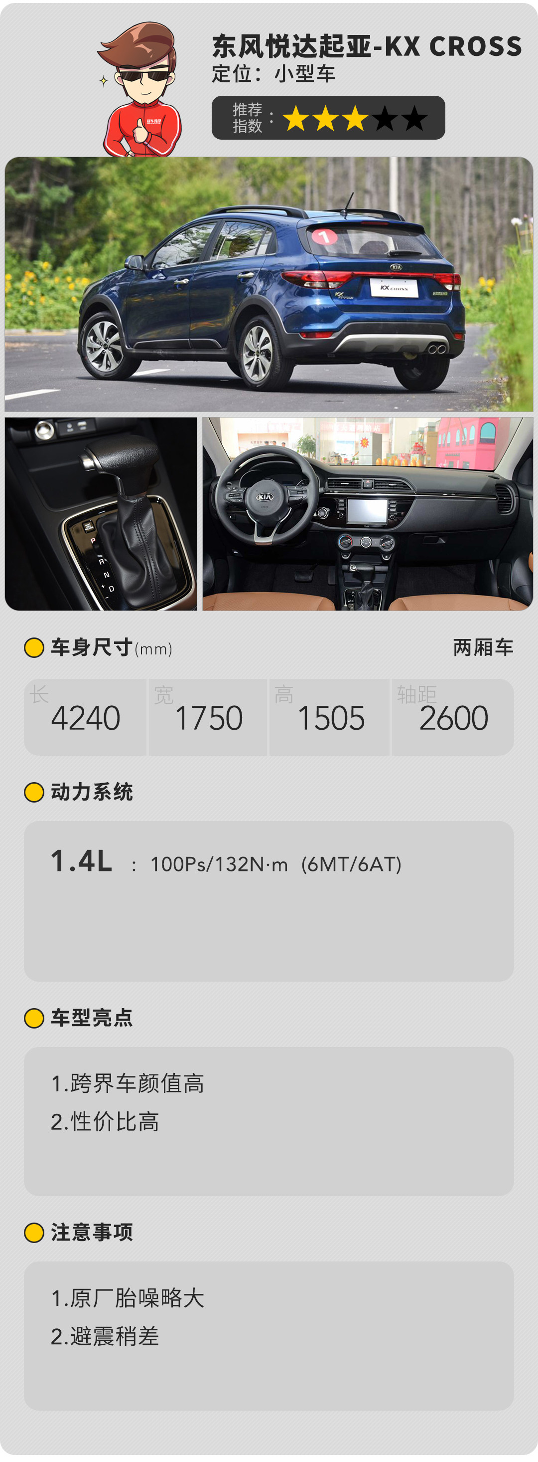 本质上它是全新K2的两厢版,厂商觉得要搞搞新意思,把它往大家喜欢的SUV方向靠拢,于是有了K2 CROSS。之后觉得还是不够彻底,索性把名字也改为KX CROSS,正是加入到SUV车型的KX家族。总体来说对于10万元以下的经济型代步车来说,算是挺好了,驾驶风格让人放松,减震说不上有质感,但是不会给人难受的感觉。