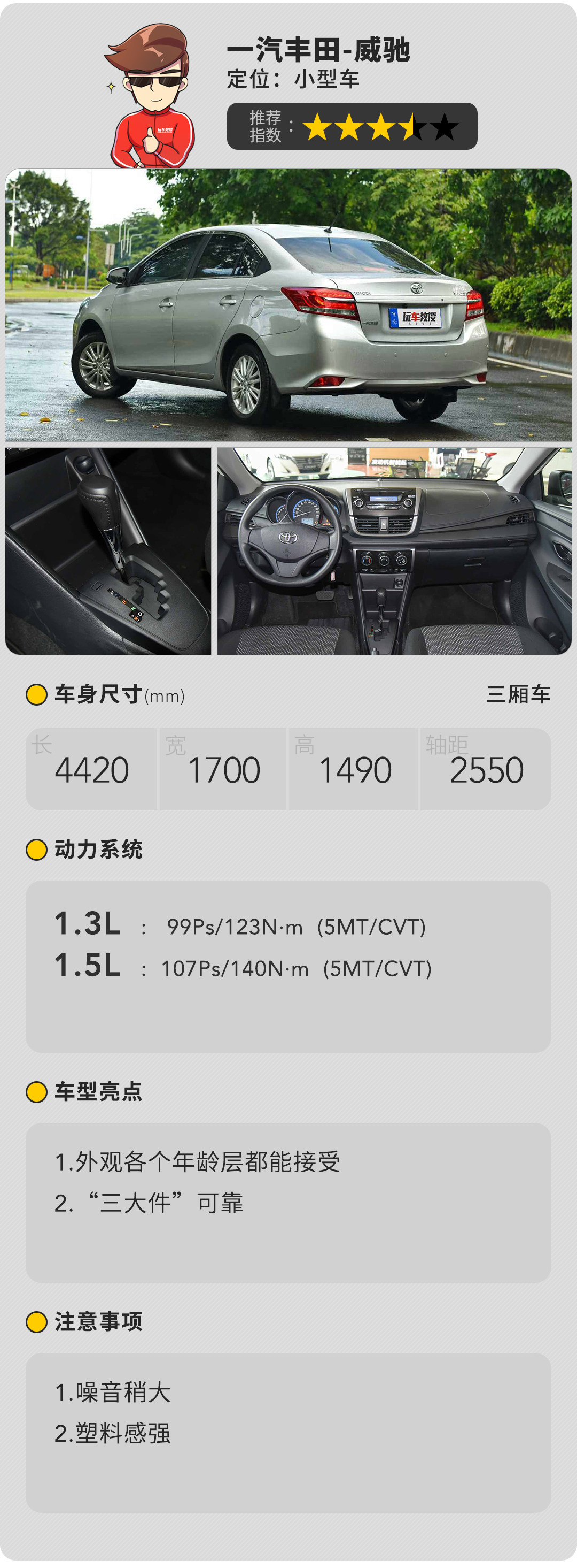 外观犀利动感,极具个性,内饰简洁大方,但作为丰田的杀手锏,威驰最大的特点就是省油耐造,而且威驰非常好开,无论新手还是女性司机都很容易上手。CVT变速箱与发动机完美匹配,平顺性和燃油经济性一流,带来不错的质感。