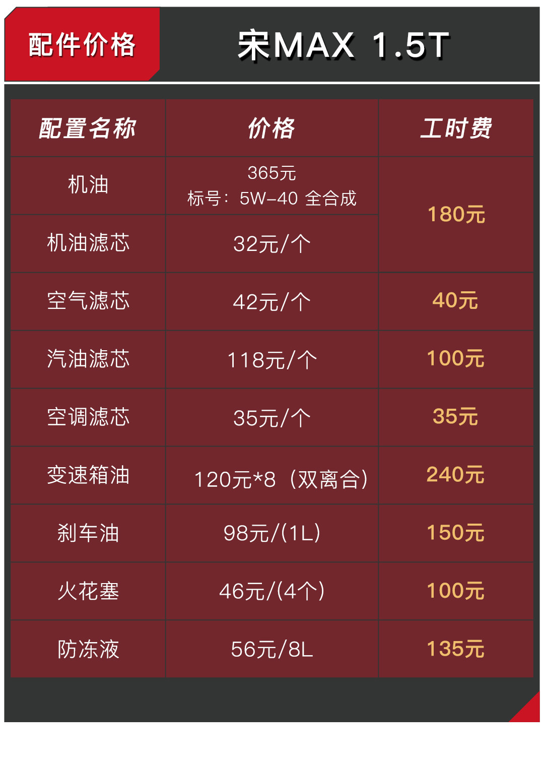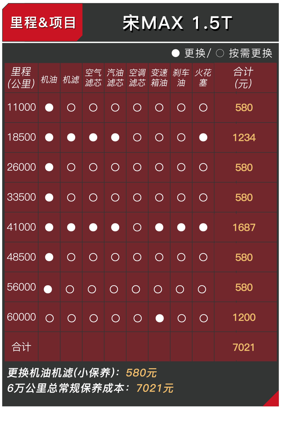 根据保养项目数据显示,宋MAX每行驶7500公里后进行更换机油和机滤,之后以6万公里为一次常规保养周期,宋MAX每次小保养的花费为580元。