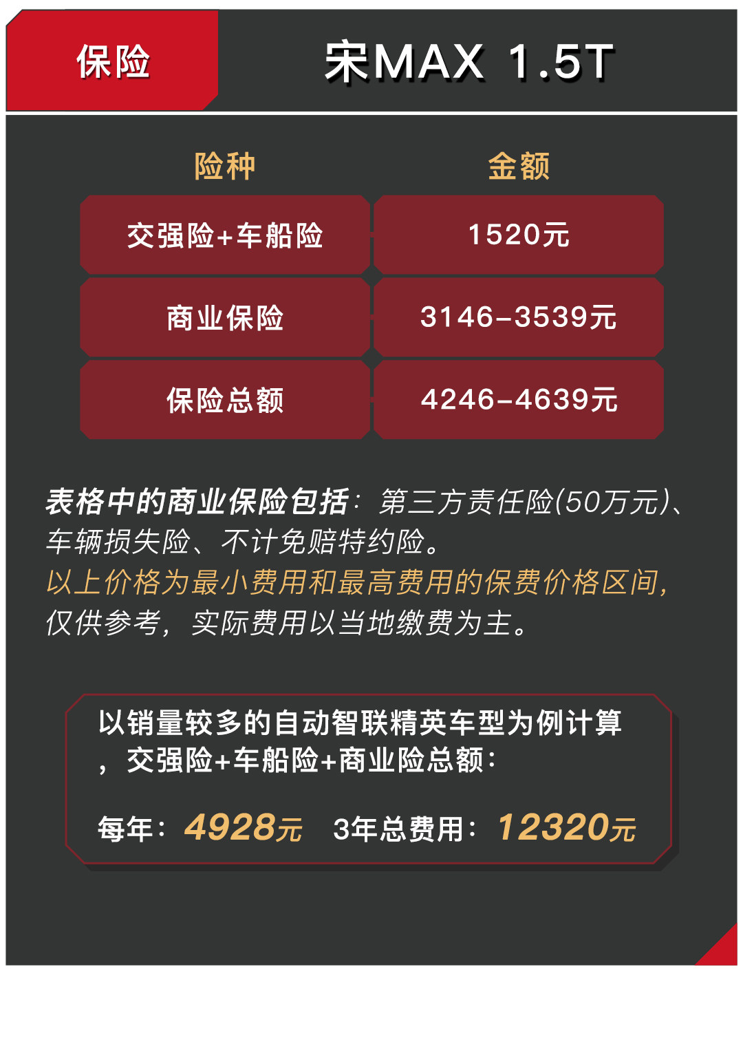 以销量较多的自动智联精英型车为例,宋MAX首年保险花费为4928元,三年在保险上的总花费为12320元。(注:未出险情况下,次年按8折计算,第三年按7折计算)