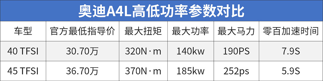 奥迪A4L高低功版本的售价相差也不是很大,与发动机匹配的均是7DCT变速箱。其中低功版的最大马力是190匹,零百加速成绩7.9秒,在同级车型中并不是太差,发动机与变速箱的衔接天衣无缝,输出稳定。