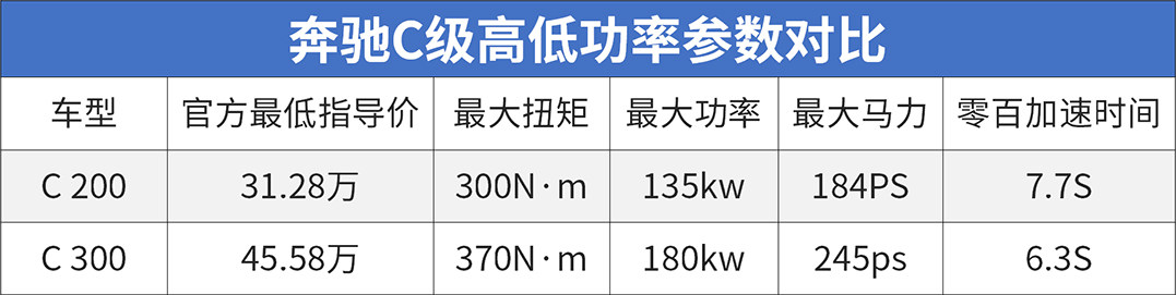 C200和C300在指导售价方面相差10万块左右,相对于A4L和S60L的高低功版售价差距略大,高低功版发动机匹配都是奔弛自主研发的9G-TRONIC变速箱,低功版车型的零百成绩为7.7秒,在1200转左右便可爆发出较强的动力,峰值扭矩可达300牛·米。