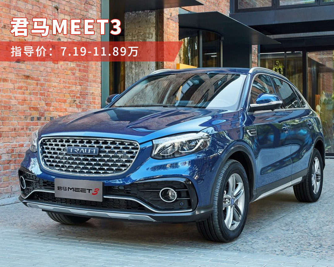 MEET3是君马汽车的第二款车型,定位是紧凑型SUV,车身尺寸为4530*1838*1610mm,加上2685mm的轴距整体并不突出。搭载了最大输出功率150马力的1.5T发动机,匹配的是5速手动挡以及CVT变速箱。整车亮点在于类似奔驰GLA的外观,内部也参考了奔驰的元素,整体算是时尚但是否喜欢就真的见仁见智。配置方面配备了全景影像、车道偏离预警系统、ESP车身稳定系统、自动驻车、电子驻车等配置,值得一提的是这是一款主打音乐主题的产品,开门时可以播放11秒音乐,高配车型还带有麦克风进行车内KTV,不过噱头大于实际作用,行车应注意安全。