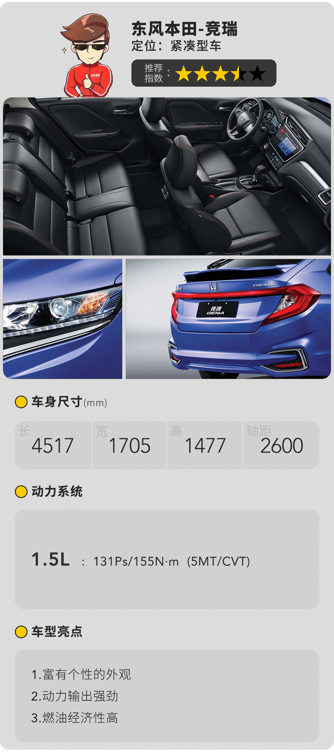 竞瑞是东风本田旗下的一款两厢掀背车,它的出现使得东本的产品线更加丰富,在外观上竞瑞还是非常独特的,主要体现在车尾部分,采用贯穿式尾灯与一体式扰流板的设计,看起来非常运动,内饰部分还是本田风格,中控部分略向驾驶员一侧倾斜,并且大部分区域采用硬塑料。在动力上则是与飞度同款的1.5L地球梦发动机,动力充沛仍然是其最大优点,操控性也不错,起步与超车都很轻松,不过在噪音方面的表现依然很差,这也是本田十万级价位车型的特色之一了。