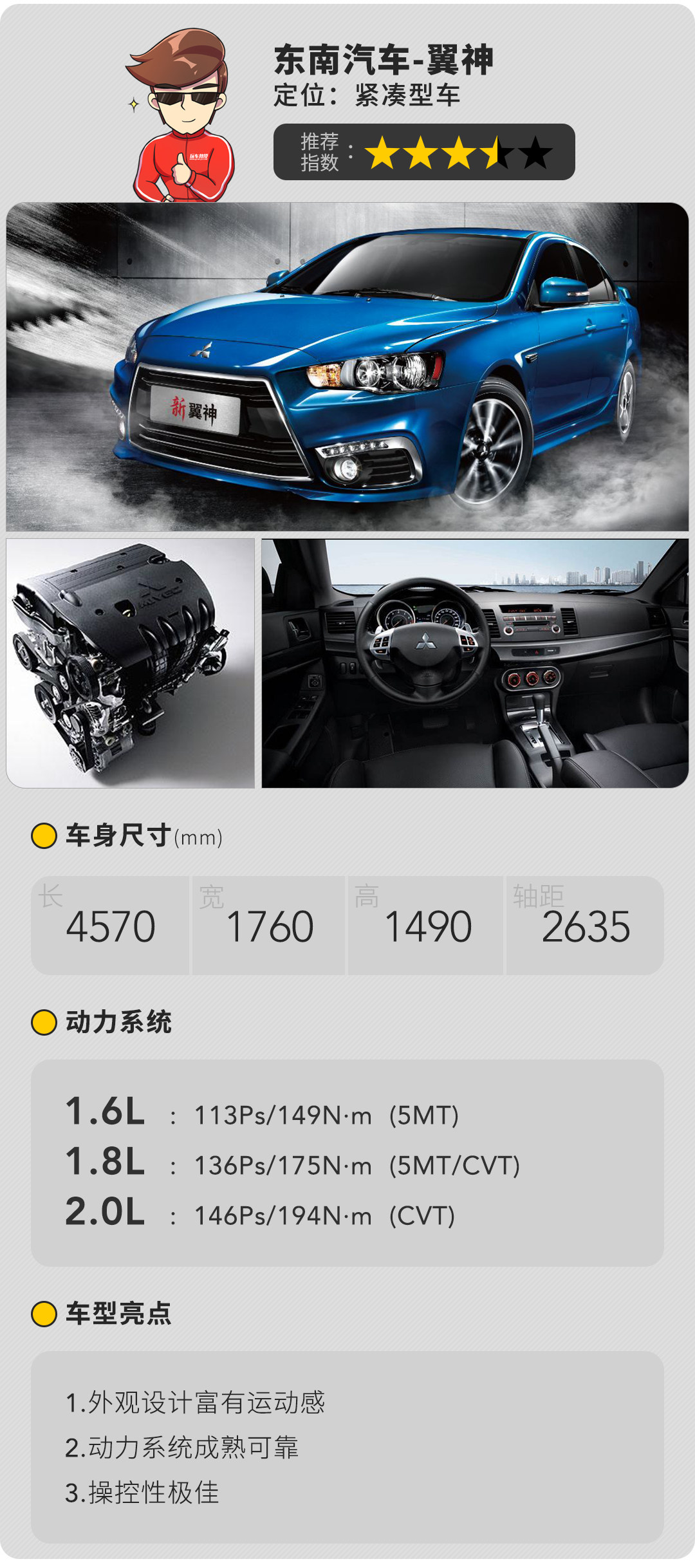 说到翼神,可能大家脑海里都会与EVO联想在一起,老款的翼神在外观上与EVO可谓是如出一辙,不过现在市面上销售的新翼神在前脸上已经有了比较大的变化,看起来更为凶悍,内饰设计向来不是三菱的强项,全黑配色的内饰相对来说比较沉闷。在动力上翼神采用的是1.6L/1.8L/2.0L三种排量的发动机,匹配5挡手动或者是CVT变速器,翼神最大的特点在于好开,油门响应细腻线性,CVT变速器平顺性非常好,最重要的是致享精准,路感回馈清晰,这样运动的调校相信对得到许多年轻消费者的喜爱。