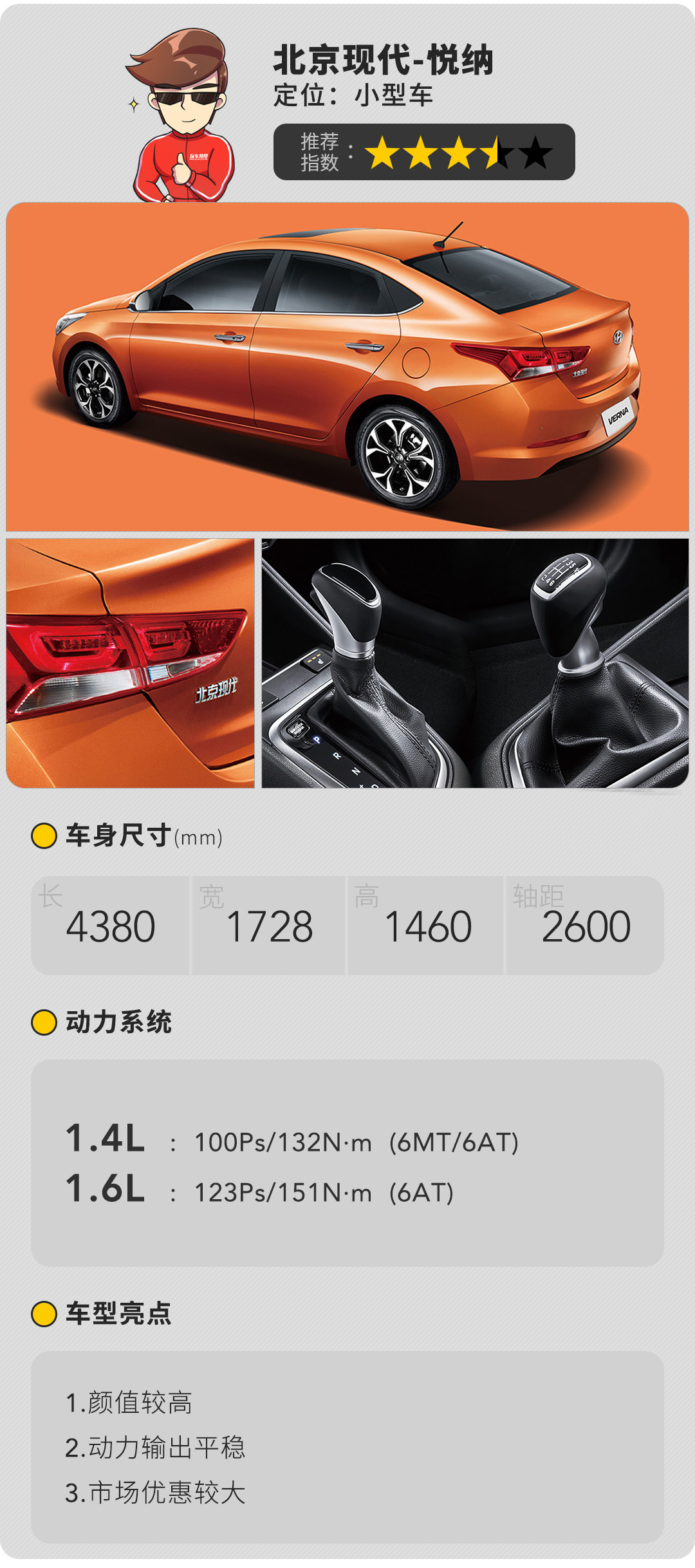 悦纳的外观采用的是流体雕塑2.0理念,六边形的进气和删与锋芒的大灯互相搭配,整体视觉效果还是非常不错的,内饰设计简洁,各个功能区分布都很合理,使用的时候很顺手。在动力上悦纳提供1.4L和1.6L发动机,搭配6挡手动或者6挡手自一体变速器,以1.4L发动机为例,其动力并不强劲,比较注重低扭的输出,变速器的逻辑比较合理,升降挡及时,悬架调校也比较有韧性,整车风格也是偏向运动风格的。
