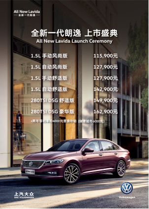 5月25日,上汽大众大众品牌Lavida家族最新成员全新一代朗逸在杭州正式上市。新车提供1.4TSI缸内直喷涡轮增压发动机和1.5L全新自然吸气发动机两种动力,搭配不同配置,共推出6款车型,售价区间11.59万元—16.29万元。