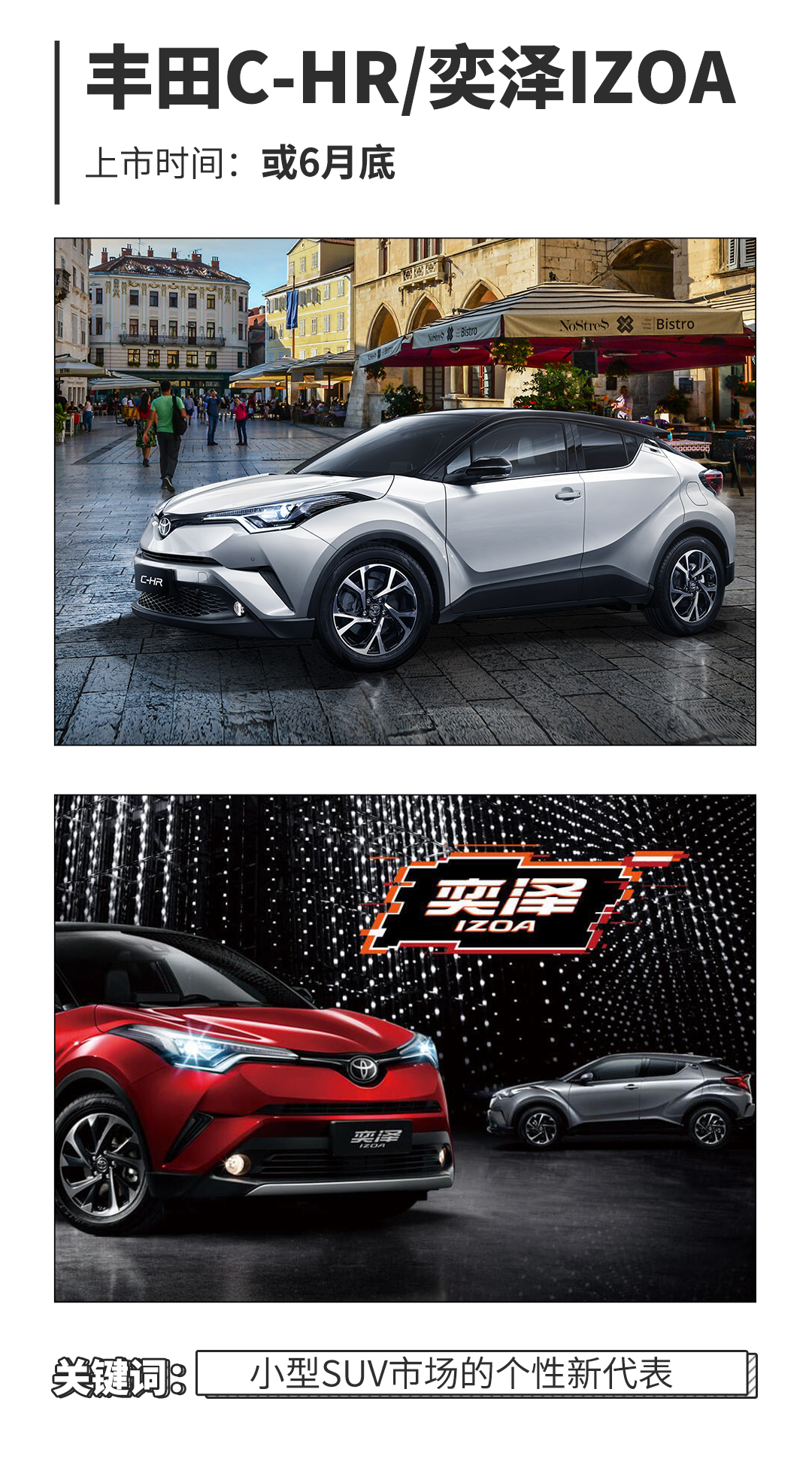 千呼万唤始出来,教授期盼已久的丰田C-HR/奕泽,终于要在6月双双上市了。它们的到来注定会令今年的小型SUV市场不平静。