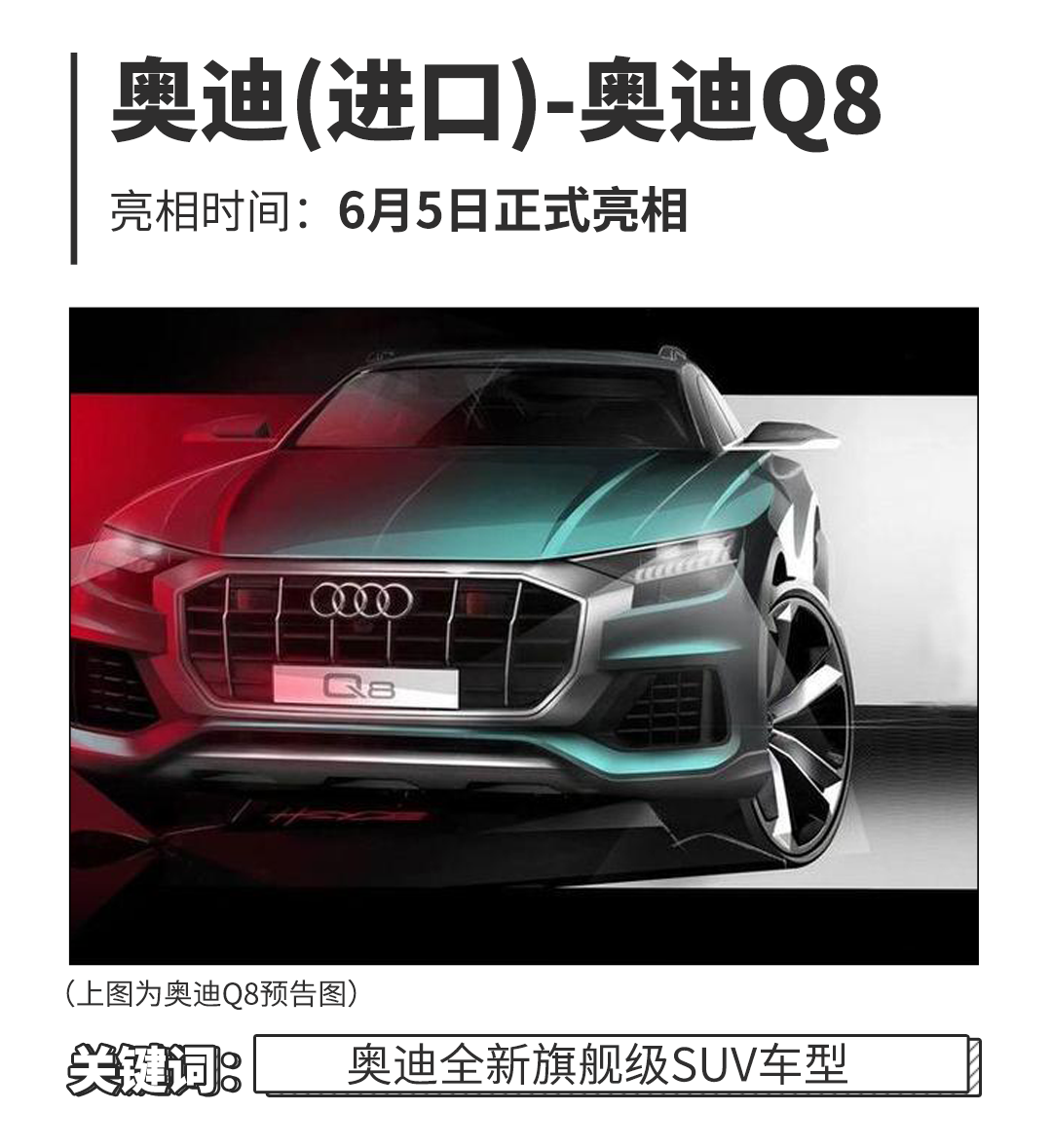 几年前呢,Q7作为奥迪品牌SUV车型的天花板已经让他们觉得并不满足,所以便有了奥迪Q8……而在6月5日,奥迪Q8将会在深圳进行全球首发。奥迪品牌、跨界SUV、最贵车型……这些关键词已经让奥迪Q8的身份在诞生之前便充满了话题性。