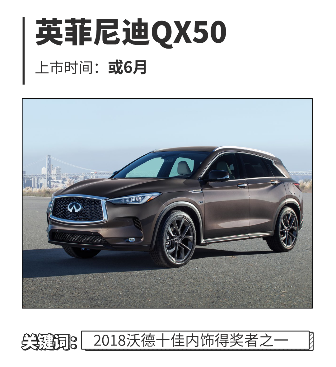 除了这些看得见摸得着的设计元素之外,QX50最大的产品亮点在于与海外版的QX50一模一样的发动机,QX50搭载的一台2.0T发动机账面参数为272Ps/380N·m;最重要的是这套动力单元有着8:1至14:1的可变压缩比,可根据驾驶者的需要进行调整,这一点在于同级别SUV来说尚属于稀罕配置,这也令教授十分期待它的动态表现究竟如何;那到底产品力不俗的QX50将会有怎样的售价呢?想必是所有人都跟教授一样迫切想要知道吧~