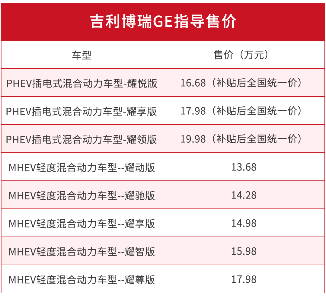 就在2018年5月28日的吉利新能源战略发布会上,博瑞GE正式上市,推出5款MHEV轻度混合动力车型,售价为13.68-17.98万元;还有3款PHEV插电混合动力车型,补贴后售价为16.68-19.98万元。