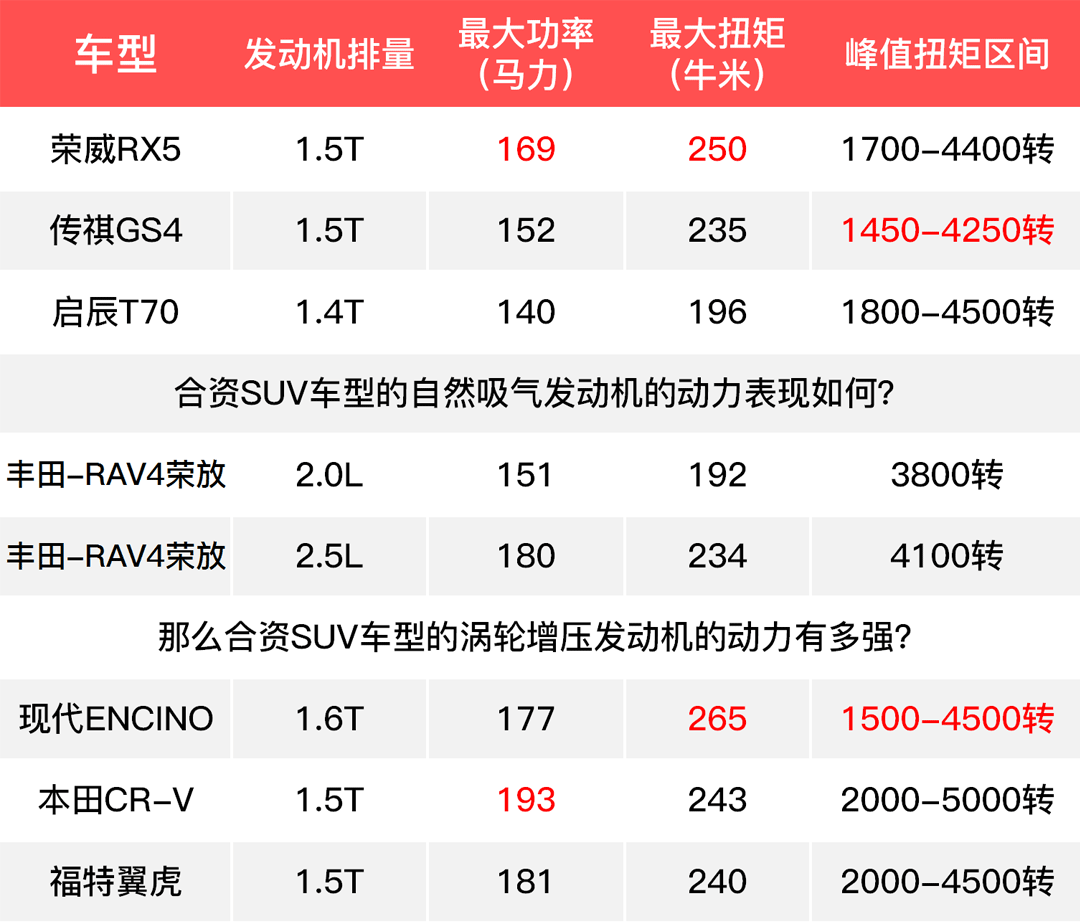 从以上的详细对比表格中我们能发现荣威RX5和传祺GS4的1.5T发动机在动力参数上已经比丰田-RAV4荣放的2.0L发动更加强劲,而且发动机的最大扭矩也已经达到2.5L发动机的水平,此外由于涡轮增压器在一千多转时就能起正压,所以峰值扭矩来的很早,当然它们一般在4500转后的动力再增长变得迟缓,所以在主观感受上有一定动力衰减的情况。