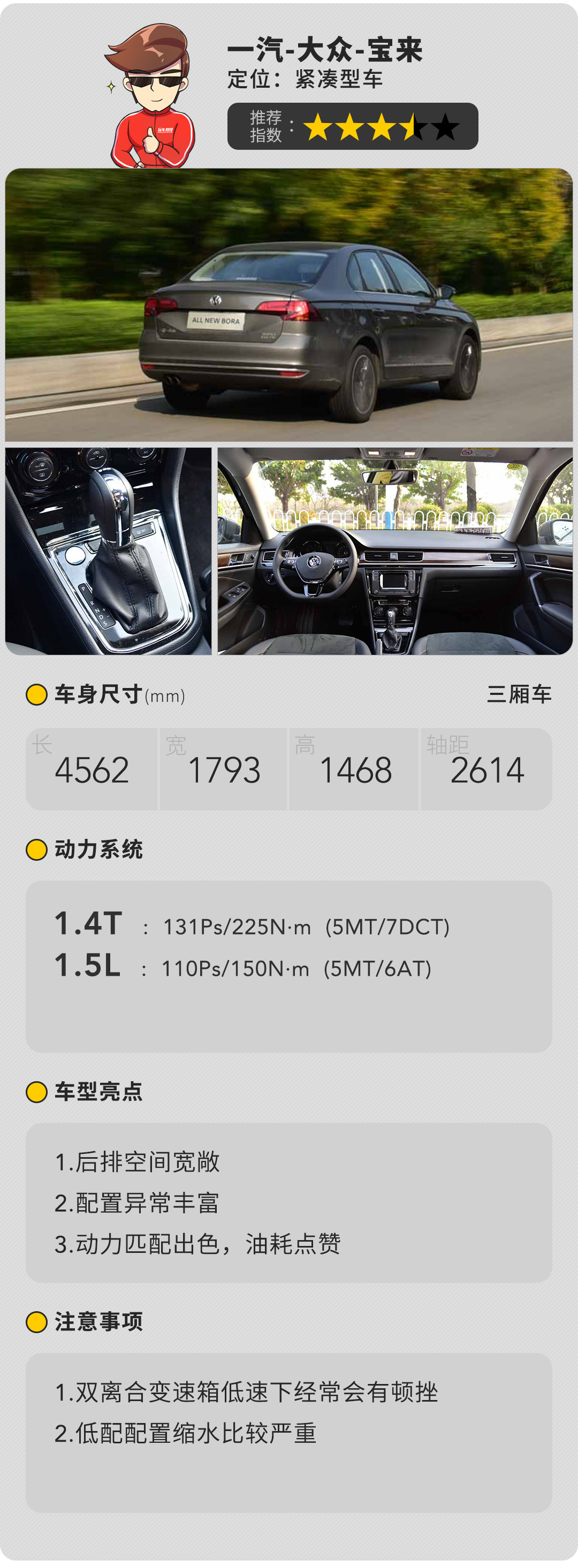 目前在售的宝来共有1.4T和1.5L共8种车型可选,实际测试下1.4T在日常驾驶能带来轻快的感觉,双离合变速箱换挡速度足够快,不会出现拖泥带水的情况,但低速下仍会出现顿挫,如果想省心踏实还是推荐购买1.5L+6AT的组合,至于为啥,大家懂的。最后必须说一下宝来已经迎来全新换代,采用MQB-A1平台,对宝来有想法的朋友不妨再等一下才入手。