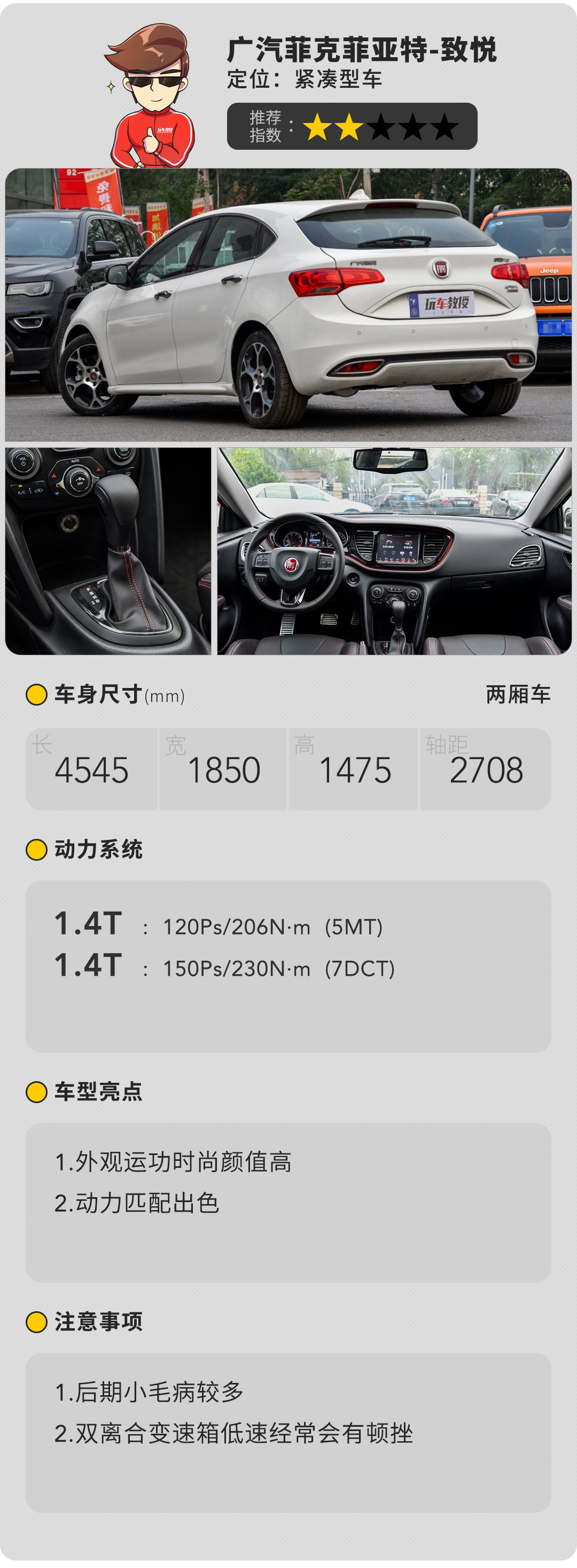 外形上致悦拥有传统意大利菲亚特的设计元素,但这车的特点不在这,而是在动力上。你不会在致悦的车型表上看到太多的版本,目前在售的致悦只有四款:手动低配、自动低配、自动中配以及自动高配。全系搭载1.4T涡轮增压发动机,分高功率和低功率两个版本,传动系统除了五速手动变速箱外,还有七速双离合变速箱可选,对于一台10万左右的小钢炮来说已经相当厚道了。而这车唯一要注意的是小毛病实在太多,毕竟是意大利的车。