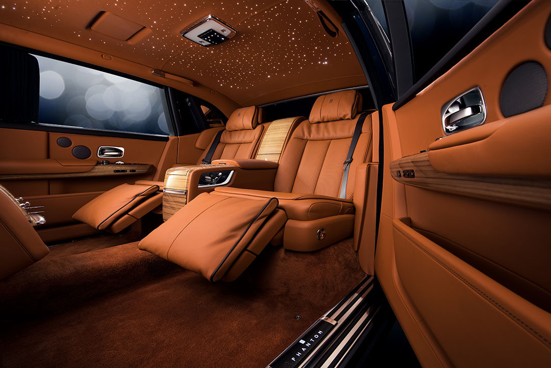 专为幻影长轴距版车型打造的“静享座椅”将奢华享受提升至全新高度:座椅间固定的中央扶手台设有存放定制香槟酒具的酒柜和冷藏箱,电子控制的座椅角度可以任意调节,并带有按摩功能和座椅及座椅扶手加热功能。腿部支撑可电动伸展90°,为后排乘客带来极致舒适的体验。