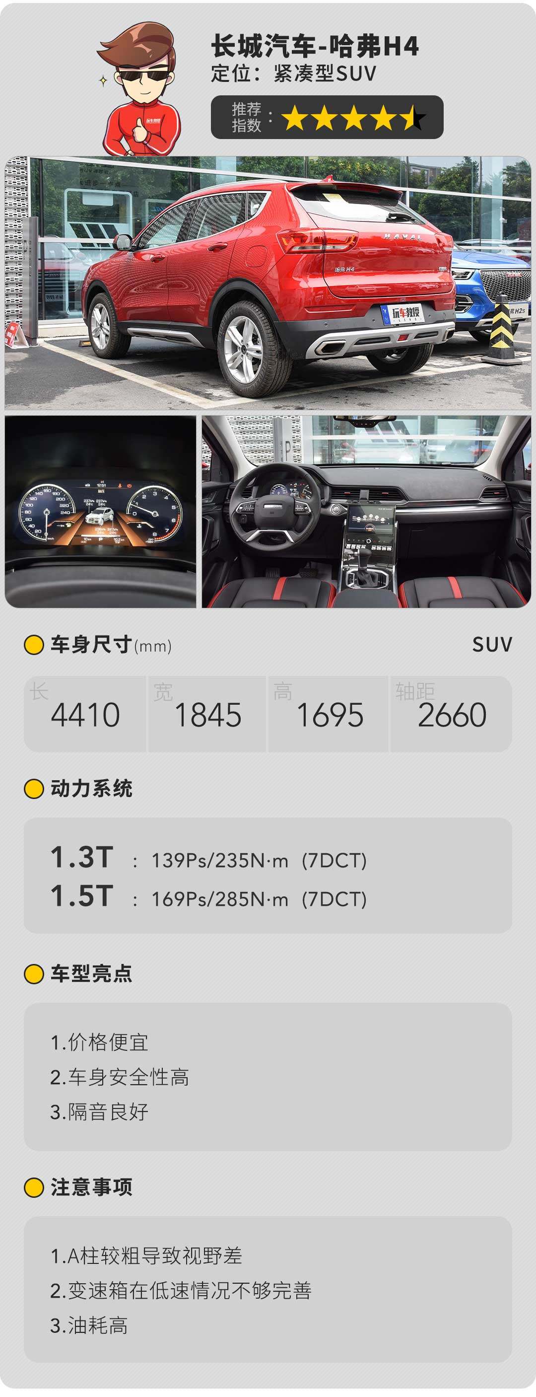 H4的推荐车型也是需要选装并线辅助系统的,而且仅有蓝标可以选装并线辅助系统。哈弗H4的这款车型的动力、配置在同价位比较有优势,属于一款高性价比的产品。值得注意的是哈弗H4的1.5T发动机油耗比较高,后期费用会稍高。