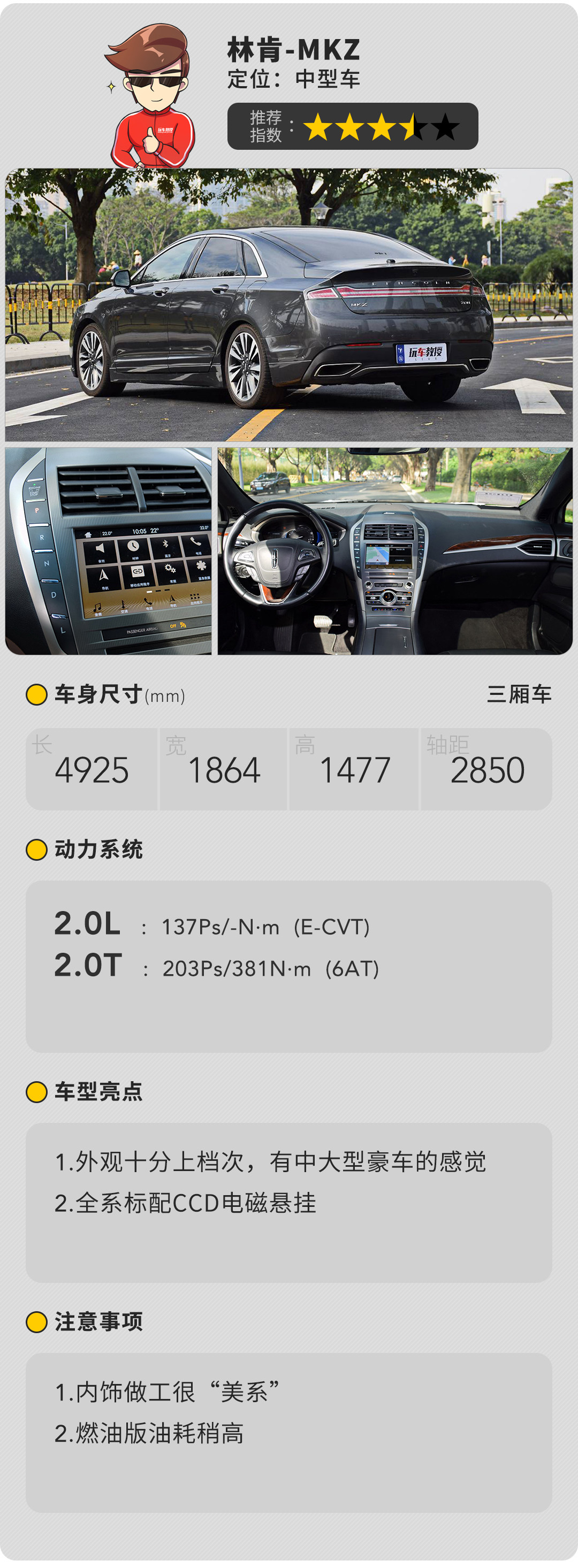 内饰符合豪华品牌的做工,但要说在风格上确实是美系车的一贯理念。说人话就是美国人对内饰要求不高,更多的是性能和配置需求。动力上采用来自福特的2.0T发动机,浑厚的声浪能保障有质量的驾驶感受。要注意的是混合动力车型虽然节油效果出色,但并不能很好的兼顾驾驶感受,尤其在大油门驾驶时噪音很大。