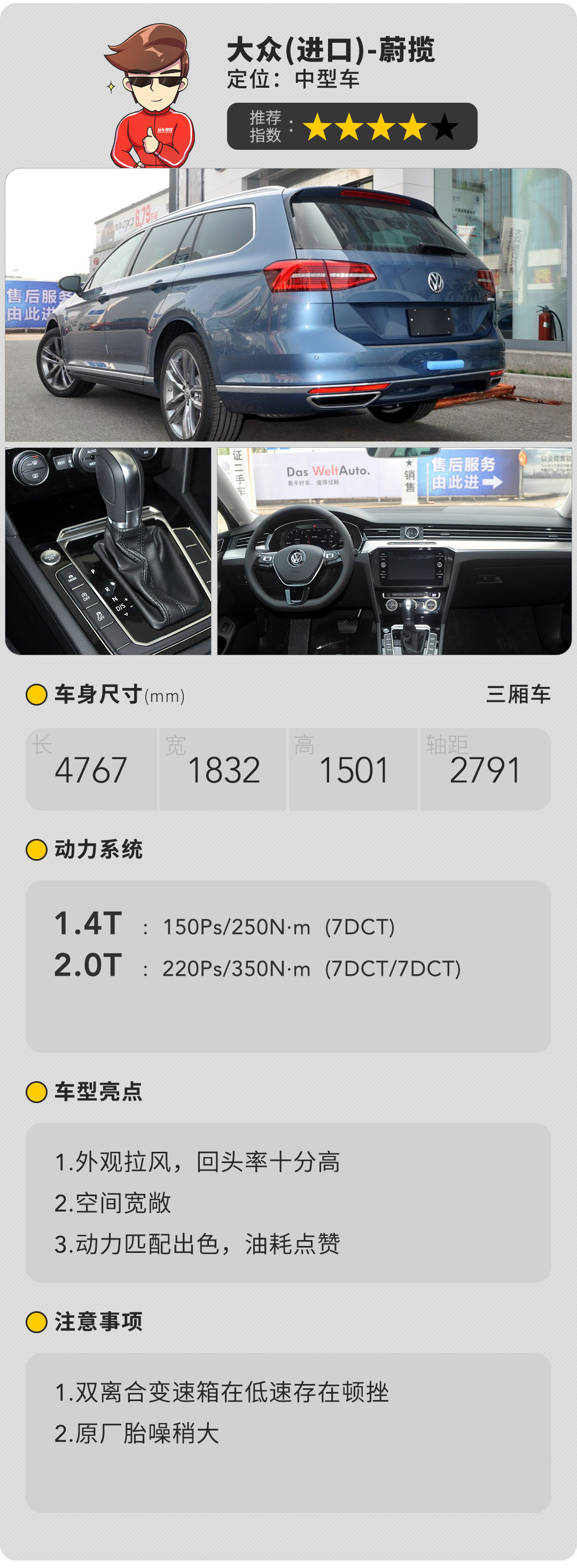 进入车内,内饰采用了典型的大众风格,说不上很惊艳,细致的做工让人没有任何不满,整个感觉如同见到老熟人一样,自然、亲切。出色的后备箱储物能力,毫无疑问是旅行车的看家本领。蔚揽后备箱常规容积达到650L,且整个空间很规整,挂钩等设施也一应俱全,实用性很强。提供了1.4T和2.0T两台发动机,经常在城市驾驶的话1.4T的动力表现还行,但经常跑高速或者山路还是推荐2.0T车型。