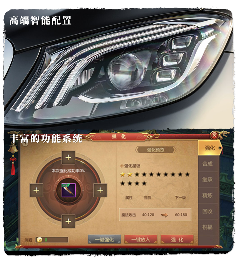 当年的虎头奔有一个电动尾门就很值得夸耀,而现在的它已经有了自动辅助驾驶、主动刹车、魔术车身、全LED大灯等高端装备,这些高科技的产物的使用就是为了让驾驶员更惬意,也更有把玩的资本。现今的游戏也在变得智能,传奇世界3D手游一键寻路、自动打怪等功能,让你更轻松玩乐;而更多的武器选择与升星系统,也能让游戏变得更为有趣。